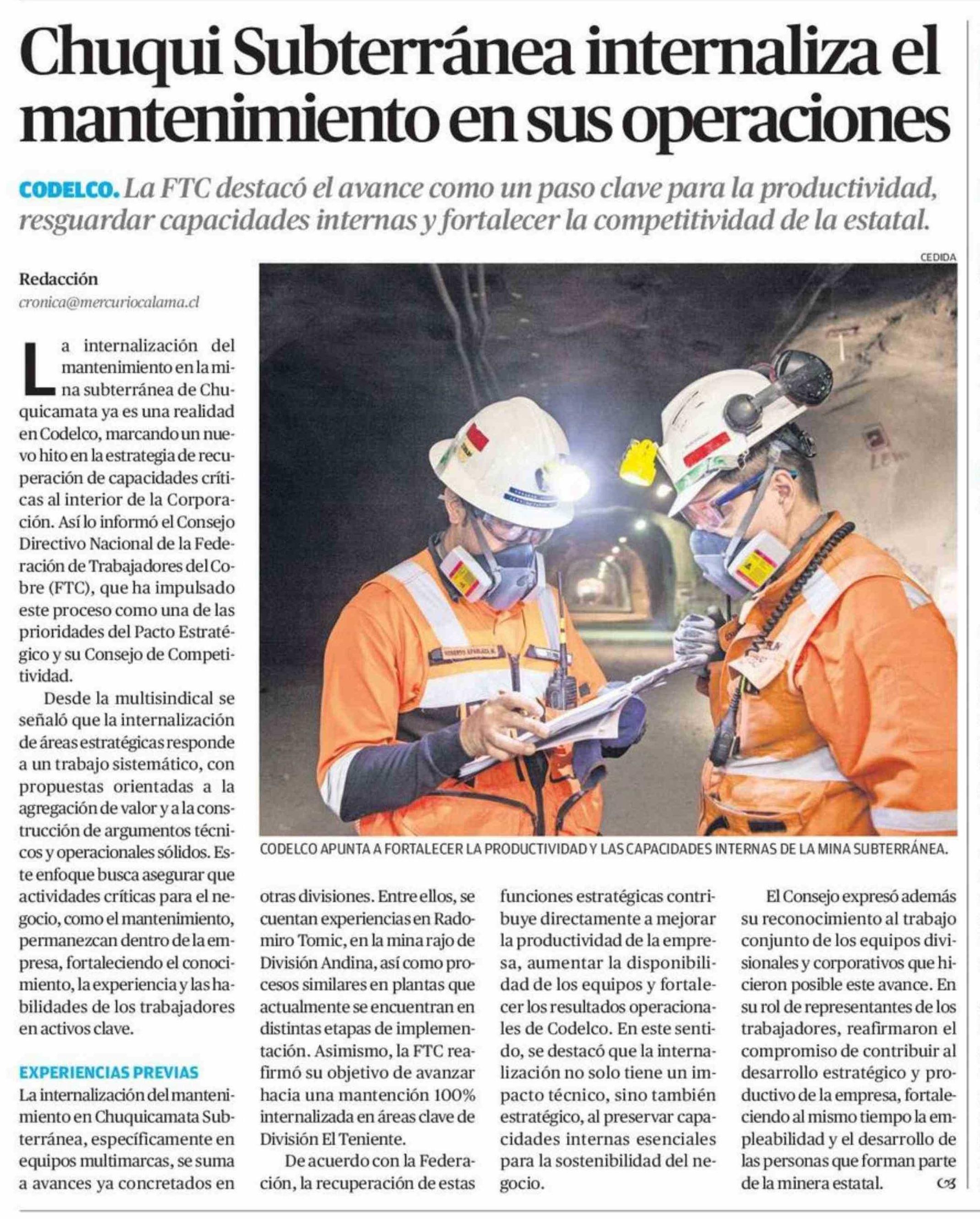 Chuqui Subterránea internaliza el mantenimiento en sus operaciones 18-01-2026 El Mercurio de Antofagasta |