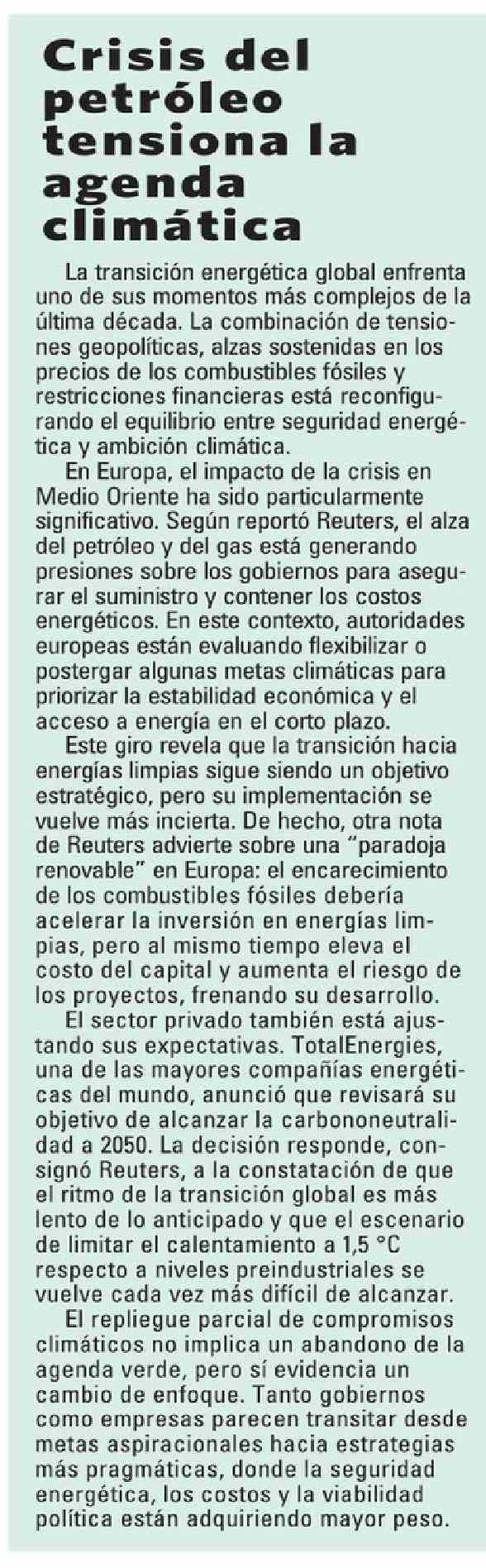 Crisis del petróleo tensiona la agenda climática 31-03-2026 El Mercurio |