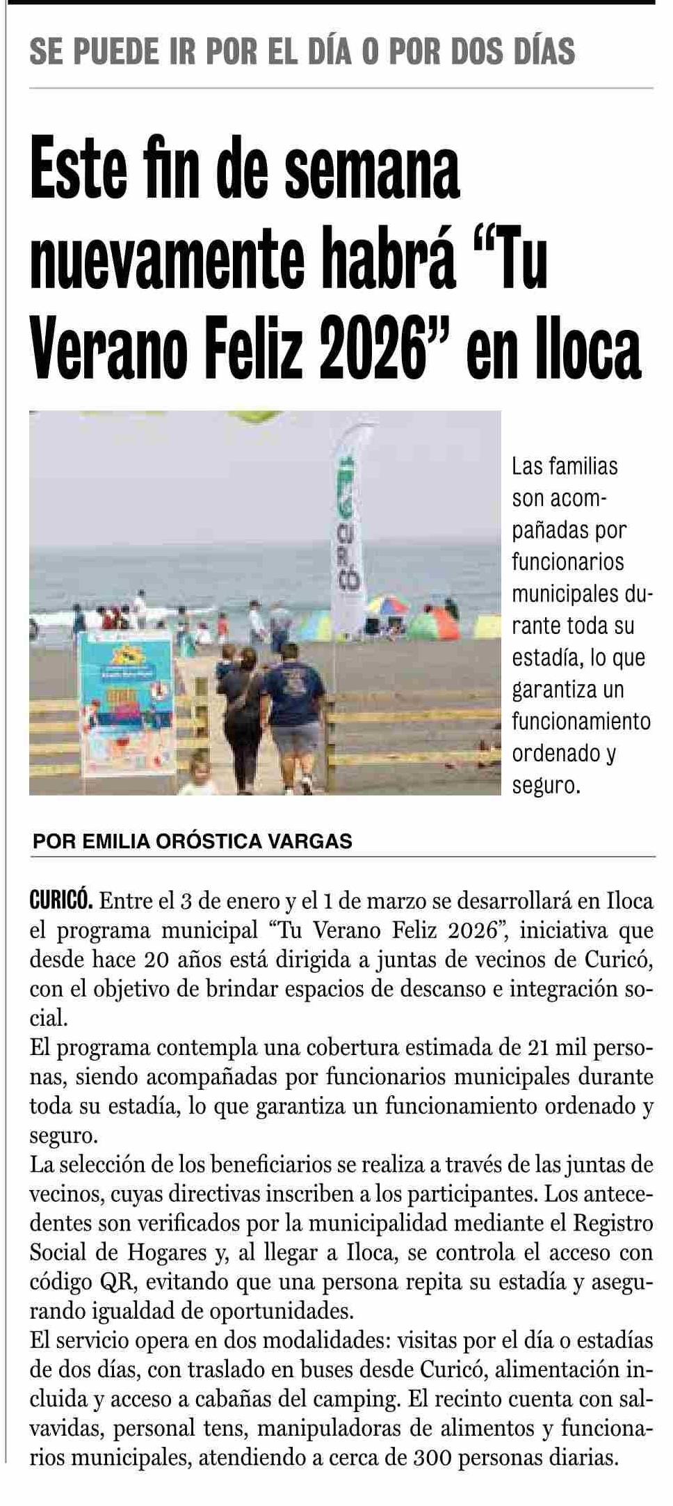 Este fin de semana nuevamente habrá "Tu Verano Feliz 2026" en lloca 15-01-2026 La Prensa de Curicó |