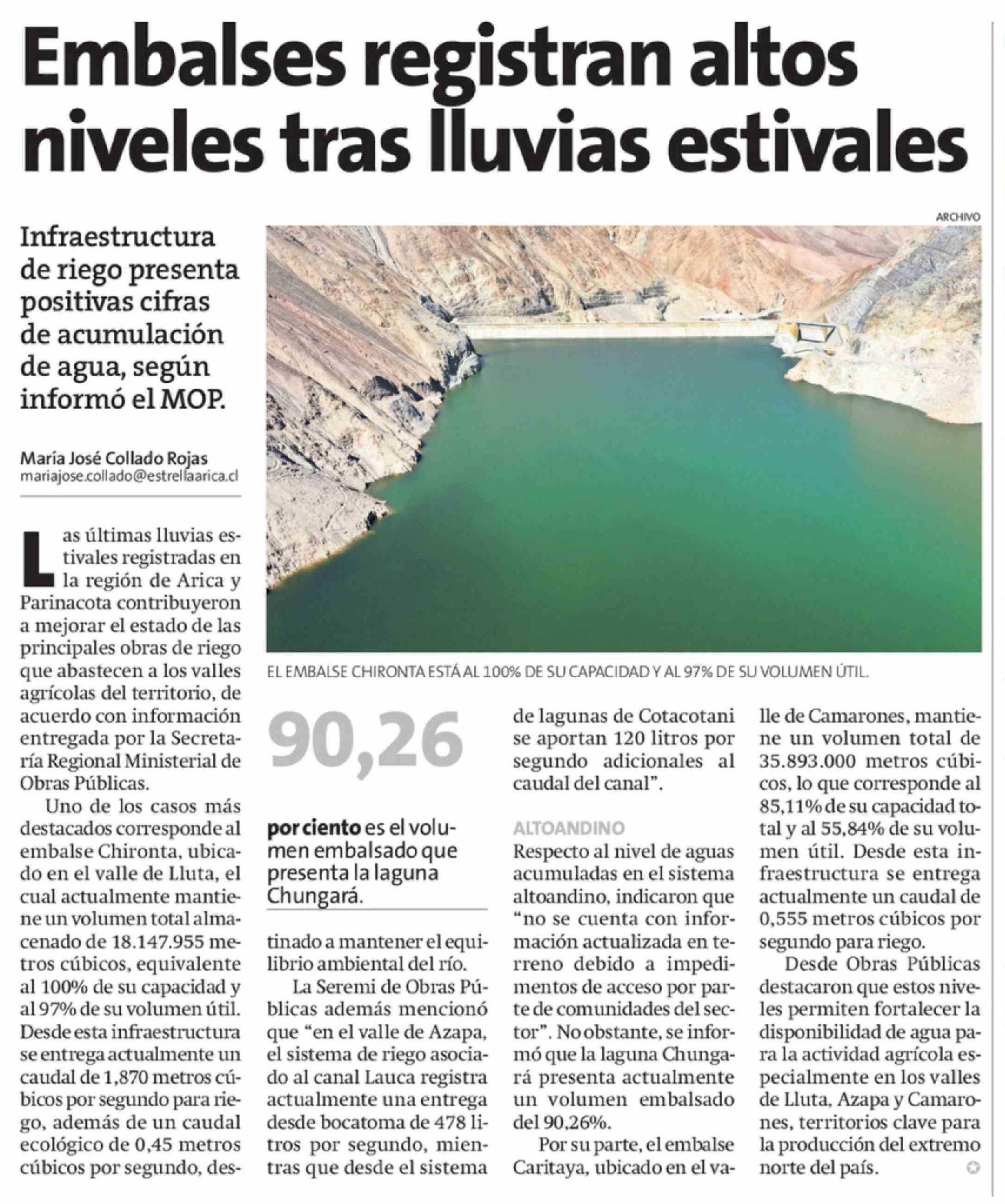 Título: Embalses registran altos niveles tras lluvias estivales