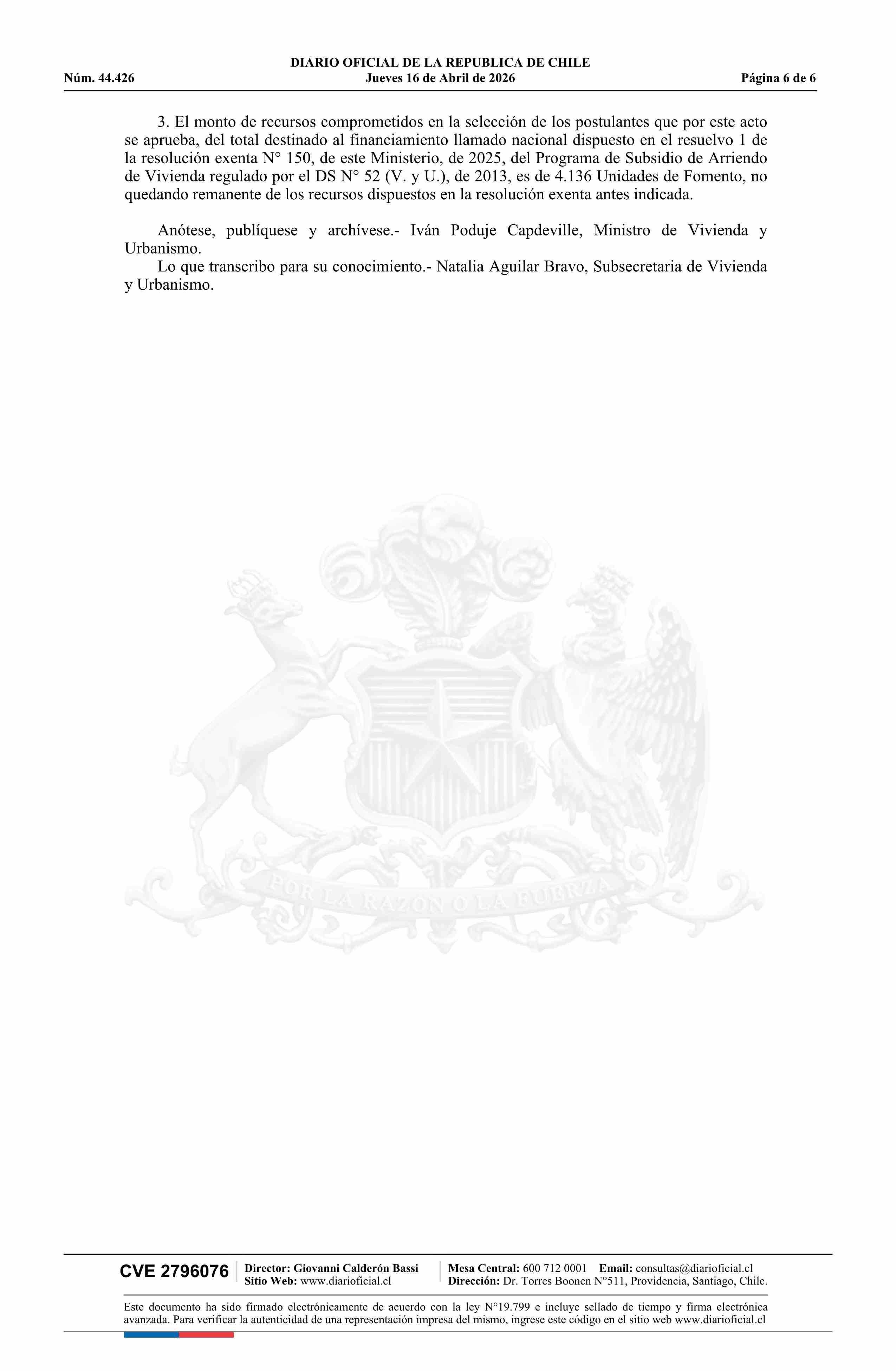 Título: Resolución exenta número 585, de 2026.- Modifica resolución N° 150 exenta, de 2025, que efectúa llamado a postulación en condiciones especiales del Programa de Subsidio de Arriendo de Vivienda, regulado por el decreto N° 52, de 2013, y complementa la nómina de postulantes seleccionados aprobada por