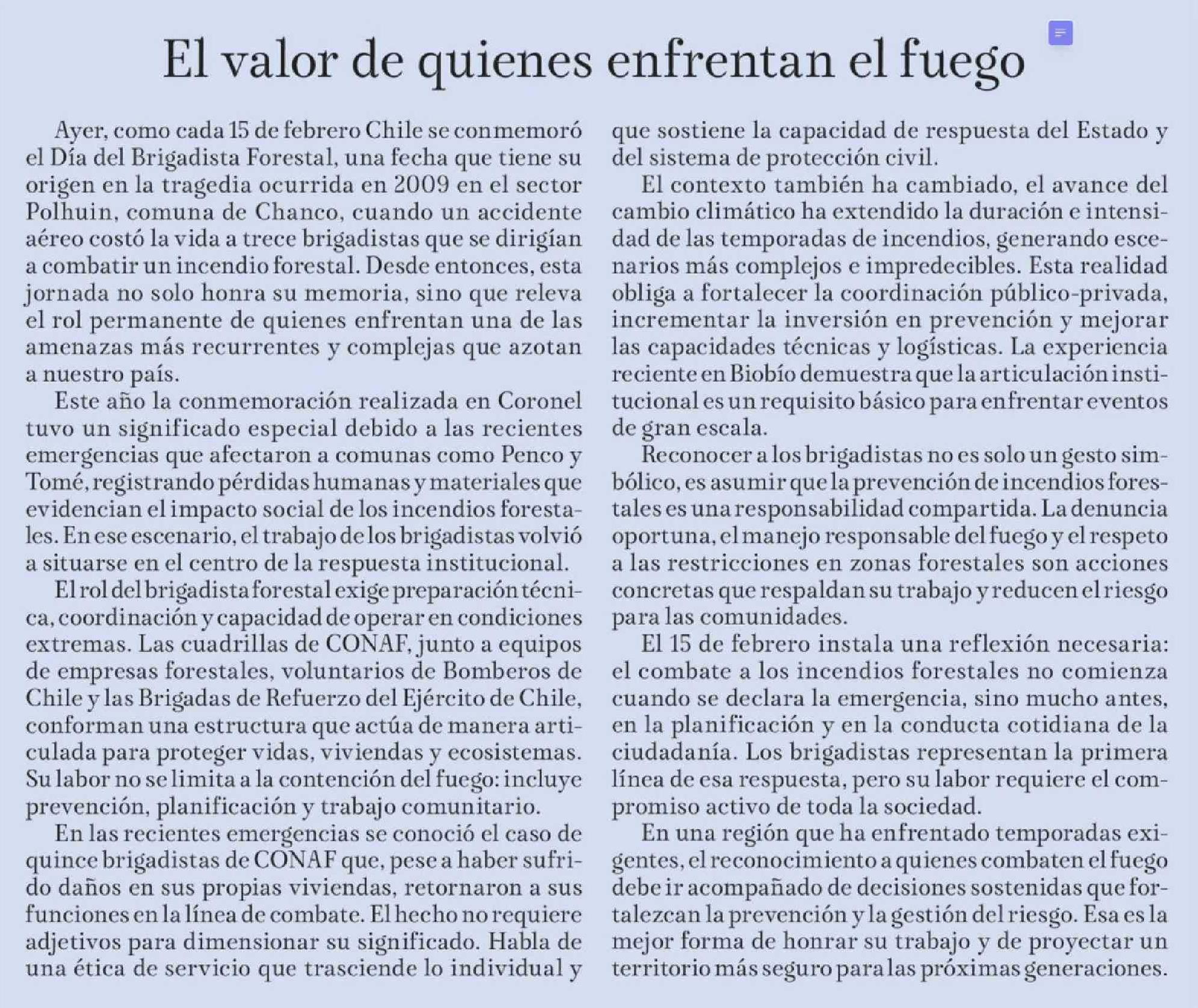 Editorial: El valor de quienes enfrentan el fuego 16-02-2026 La Tribuna |