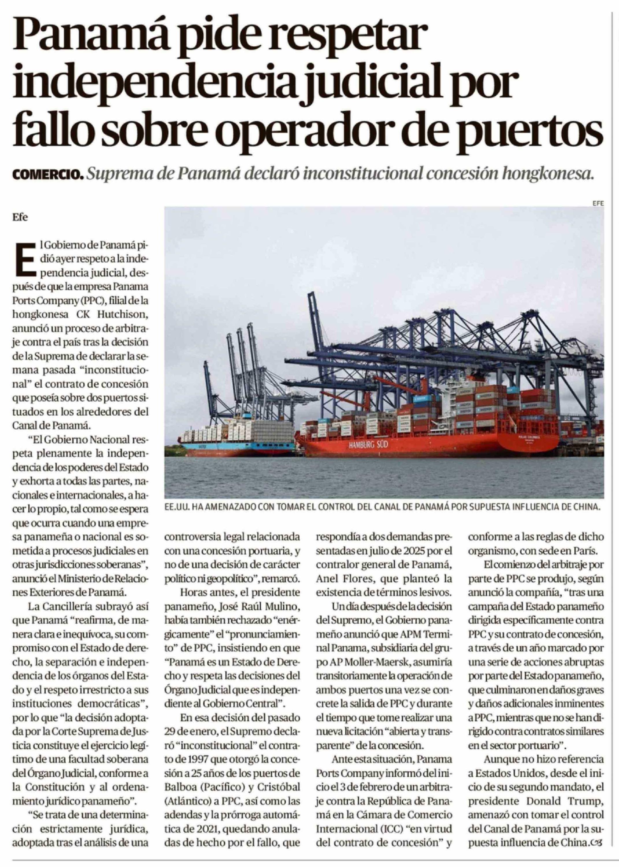 Panamá pide respetar independencia judicial por fallo sobre operador de puertos 05-02-2026 El Llanquihue |