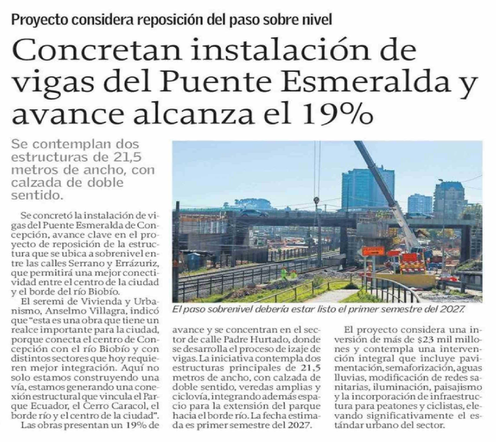 Concretan instalación de vigas del Puente Esmeralda y avance alcanza el 19% 10-04-2026 El Sur |