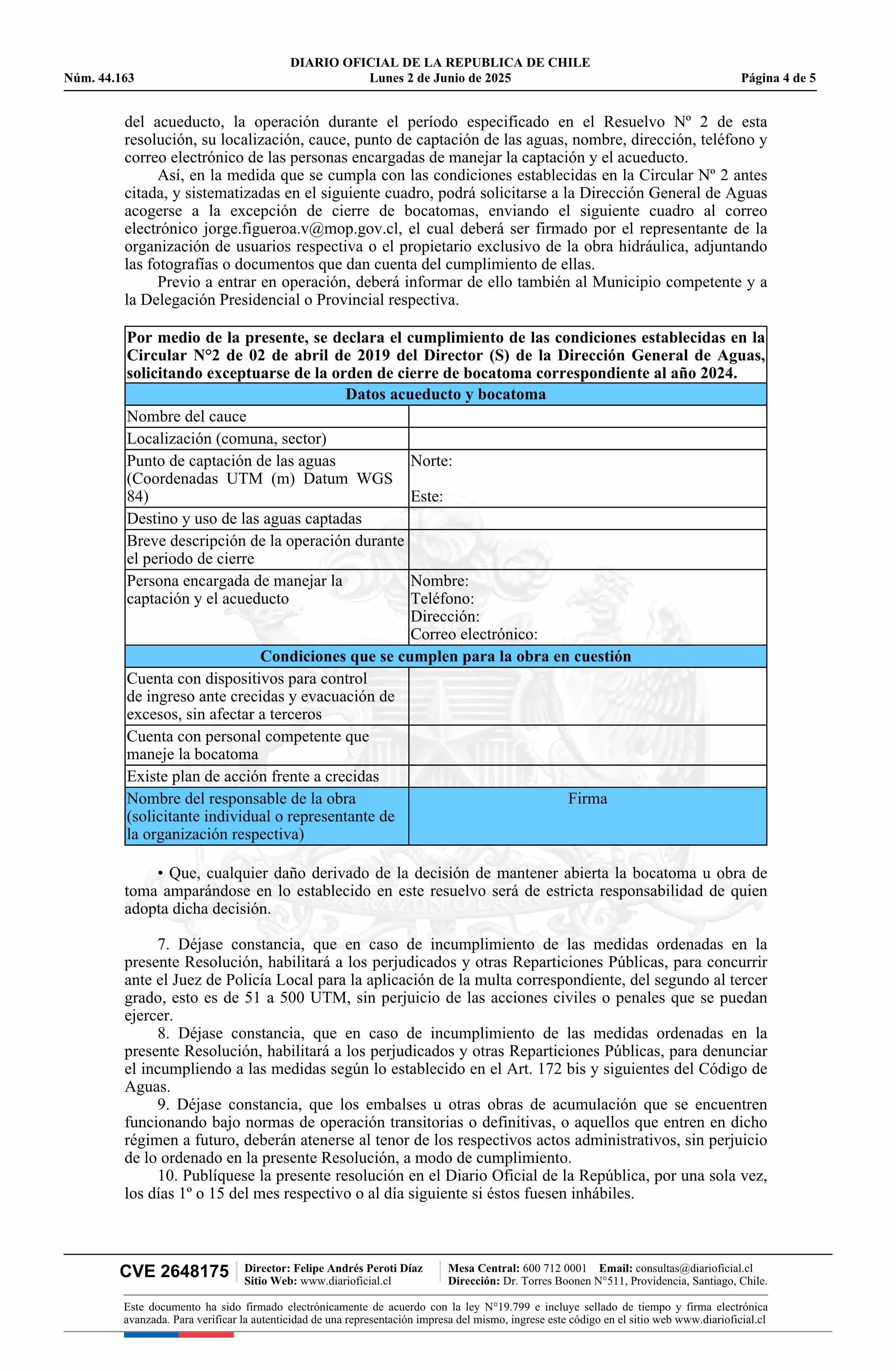 Resolución exenta número 1.007, de 2025.- Ordena el cierre de bocatomas, otras medidas adicionales y se adopten acciones preventivas para la operación de canales, embalses o tranques en época de lluvias, en la Región del Libertador General Bernardo O’Higgins