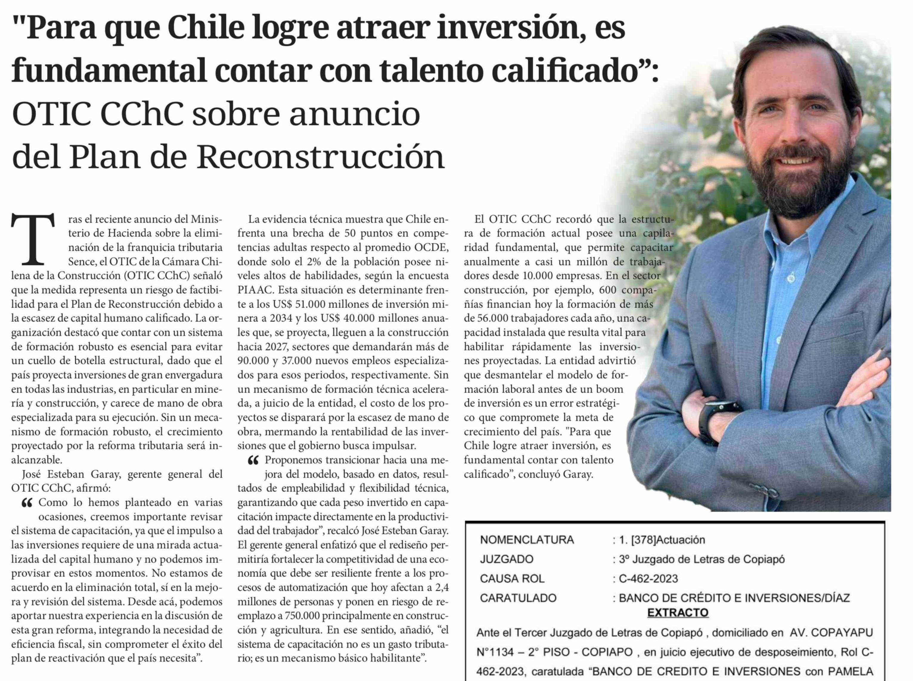 Título: "Para que Chile logre atraer inversión, es fundamental contar con talento calificado": OTIC CChC sobre anuncio del Plan de Reconstrucción