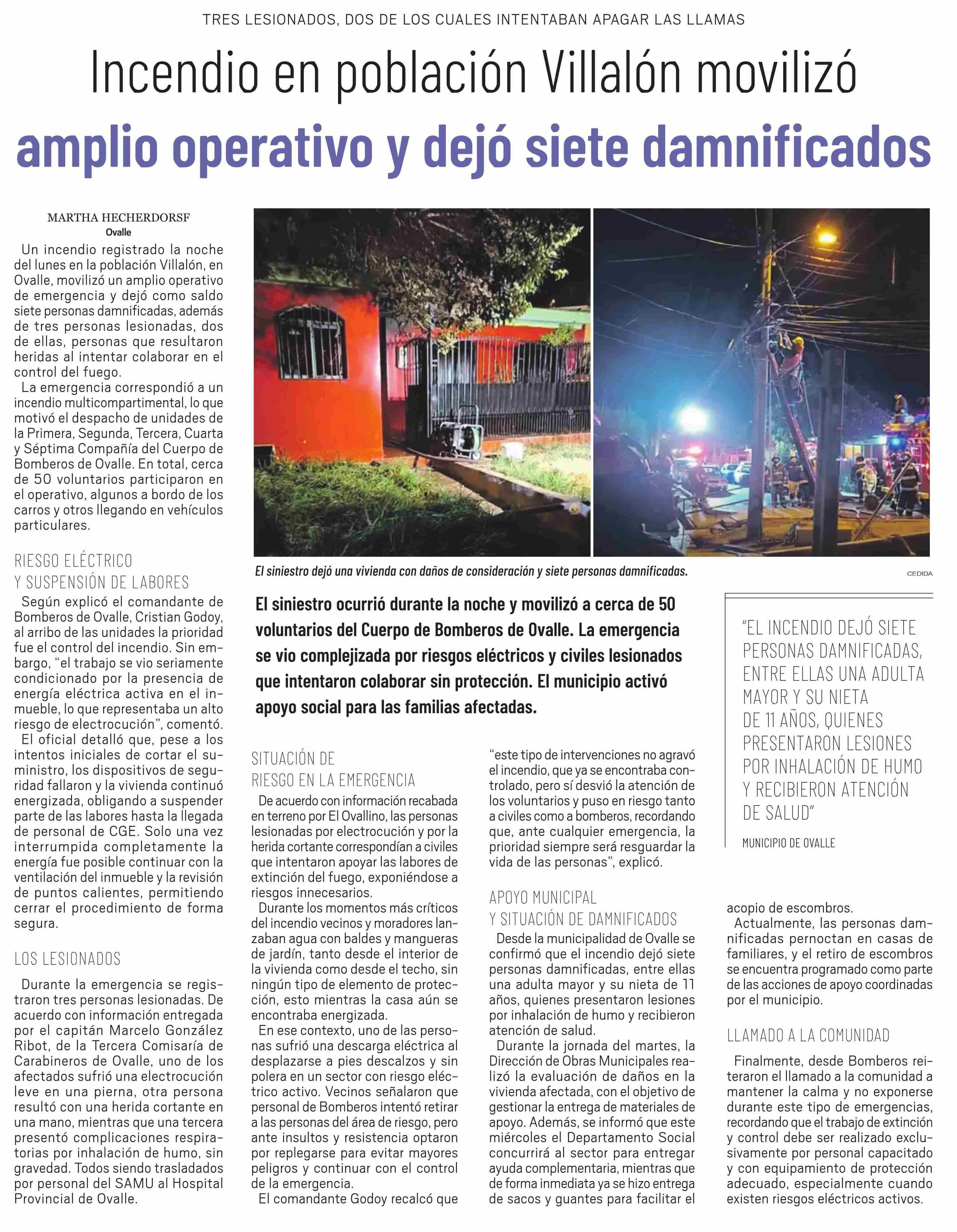 Incendio en población Villalón movilizó amplio operativo y dejó siete damnificados 14-01-2026 El Ovallino |