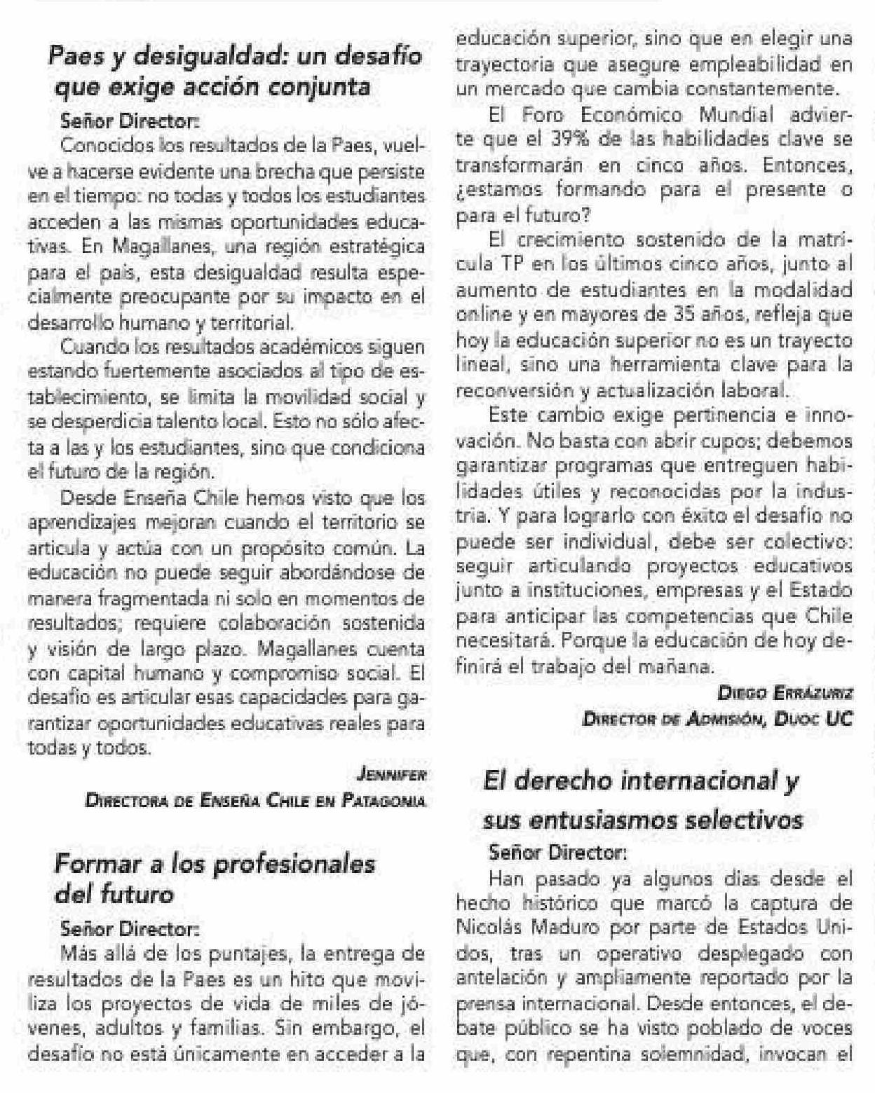 Cartas: Formar a los profesionales del futuro 10-01-2026 La Prensa Austral |