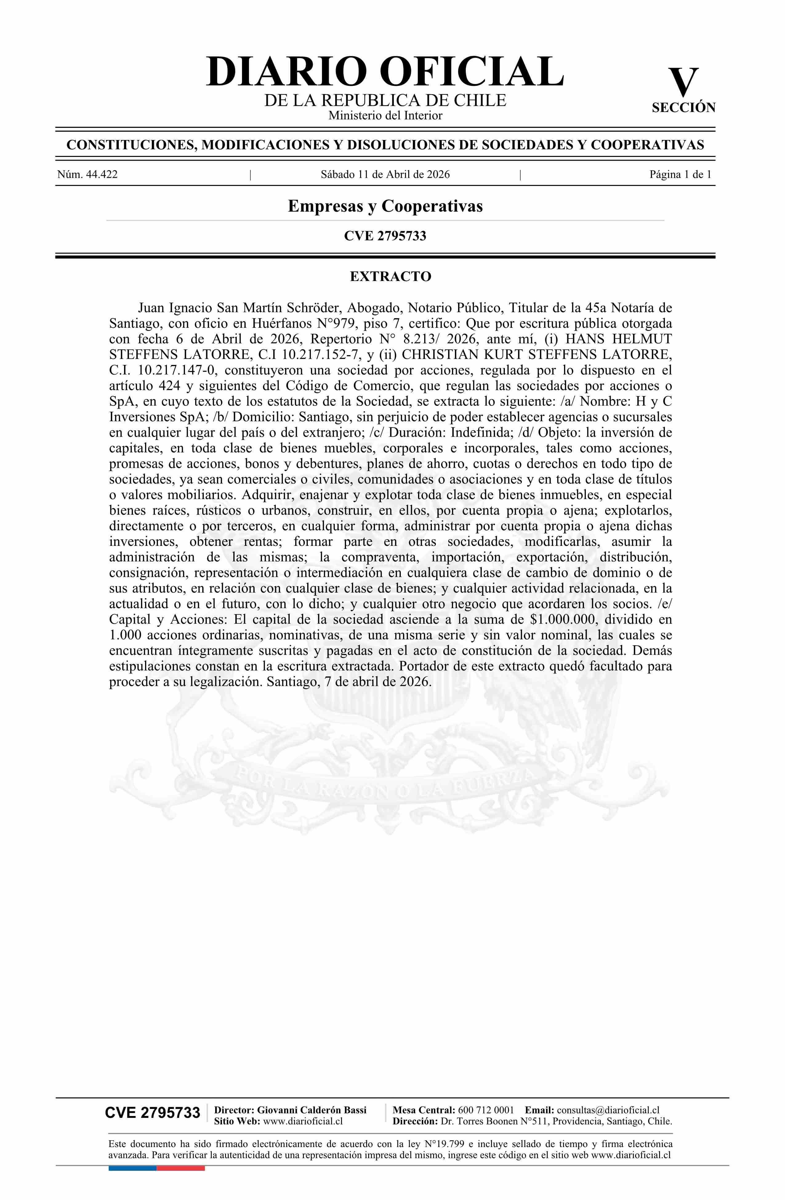 Título: H y C Inversiones SpA