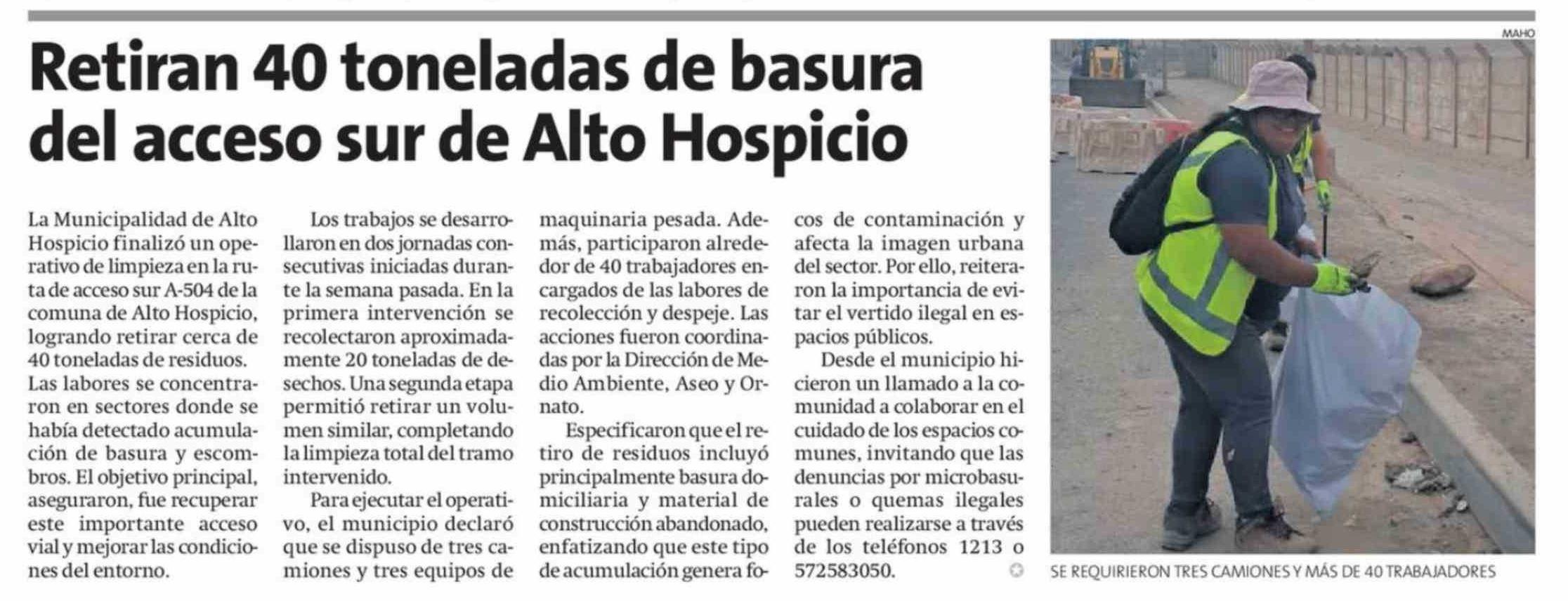 Título: Retiran 40 toneladas de basura del acceso sur de Alto Hospicio