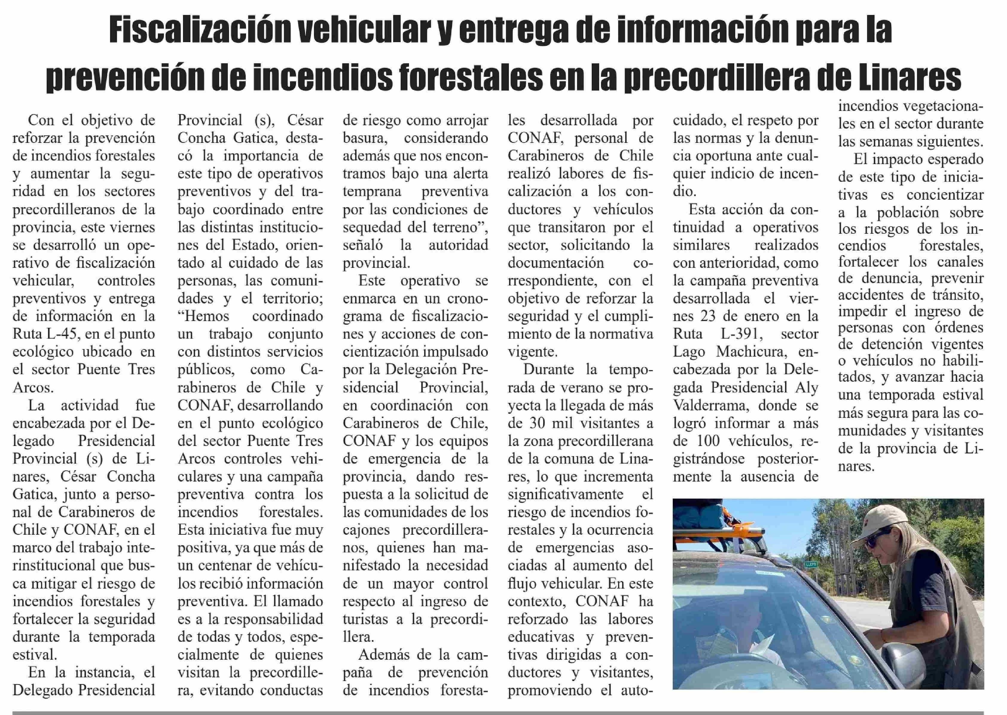 Fiscalización vehicular y entrega de información para la prevención de incendios forestales en la precordillera de Linares