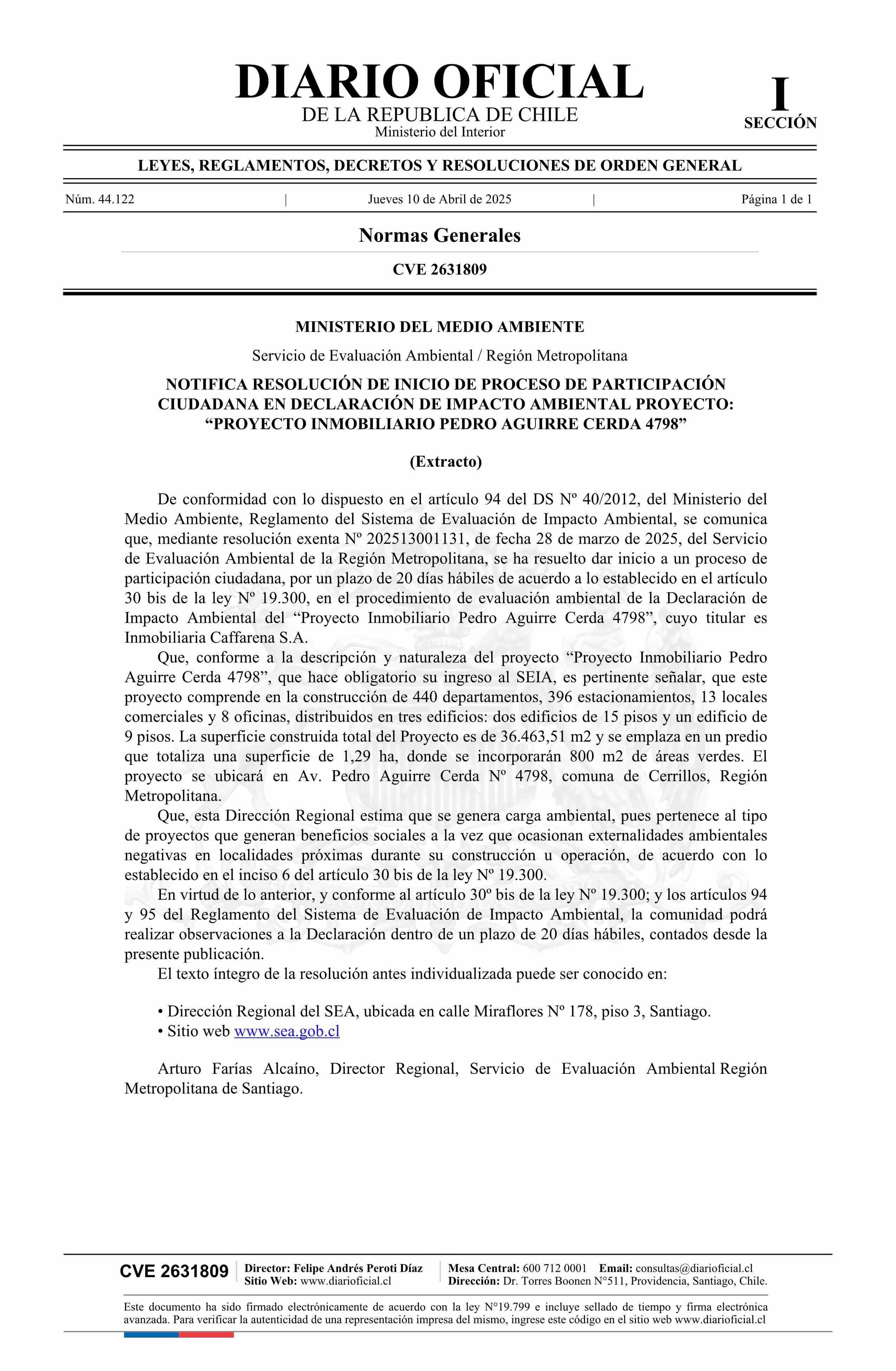 | Título: | Extracto de resolución exenta número 202513001131, de 2025.- Inicia proceso de participación ciudadana en Declaración de Impacto Ambiental del Proyecto Inmobiliario Pedro Aguirre Cerda 4798 |