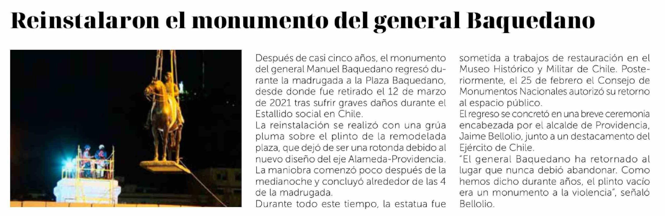 Reinstalaron el monumento del general Baquedano 11-03-2026 La Discusión |