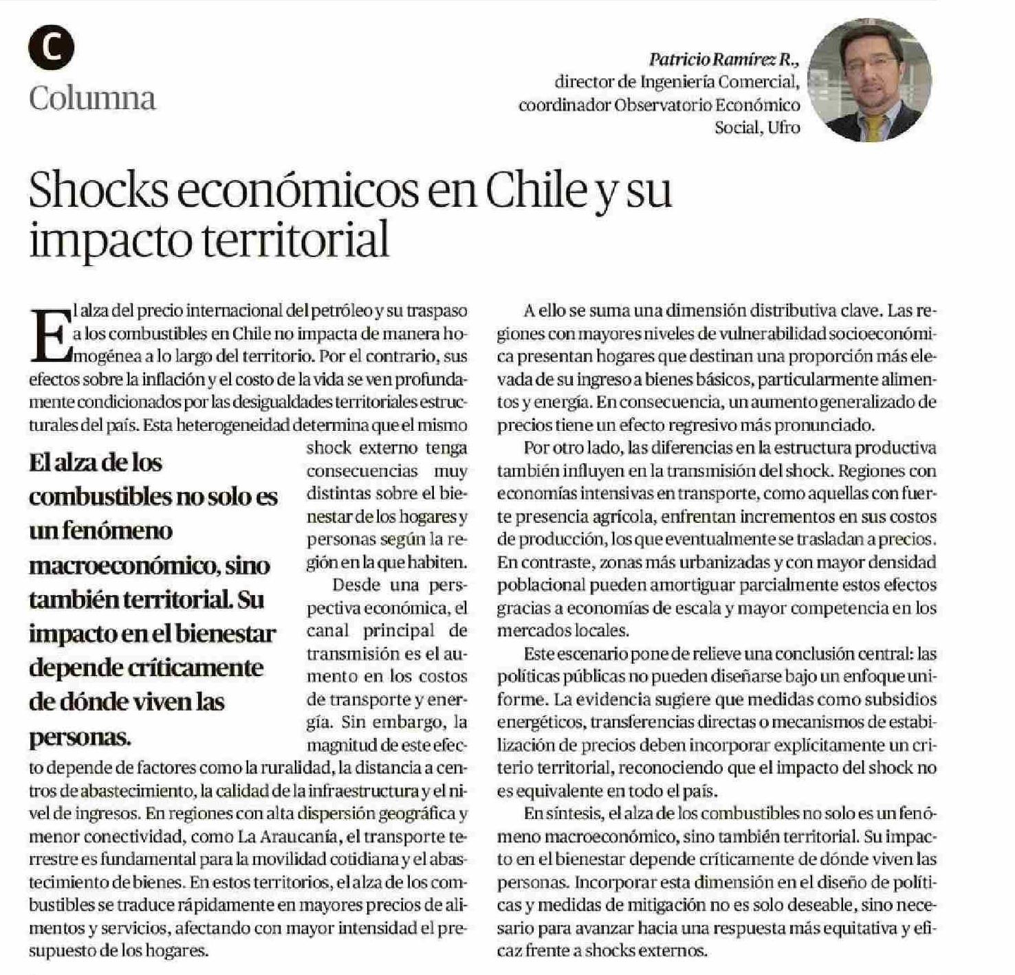 COLUMNAS DE OPINIÓN: Shocks económicos en Chile y su impacto territorial 15-04-2026 El Austral de la Araucanía |