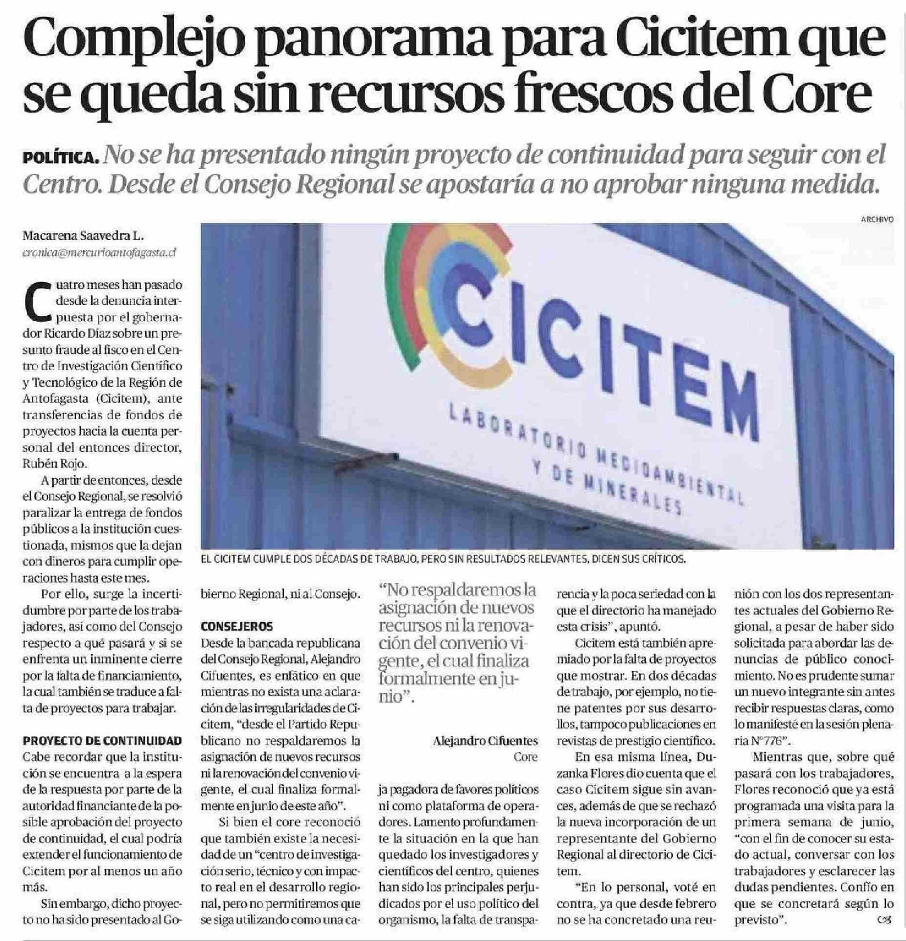 Complejo panorama para Cicitem que se queda sin recursos frescos del Core 02-06-2025 El Mercurio de Calama |