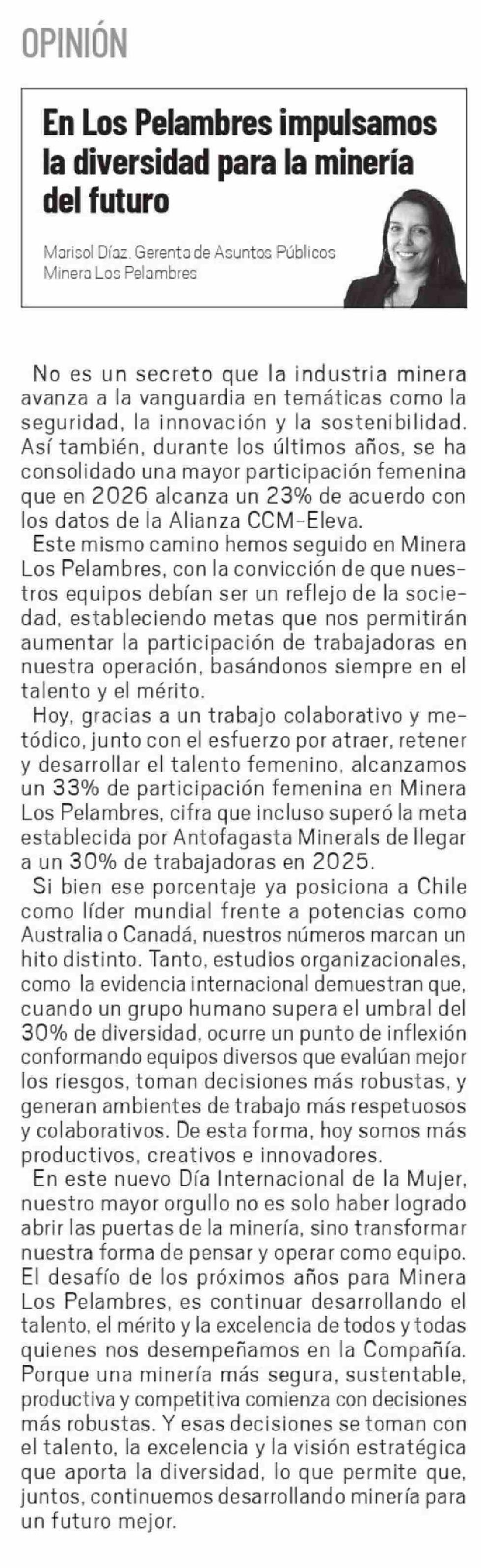 Título: Columnas de Opinión: En Los Pelambres impulsamos la diversidad para la minería del futuro