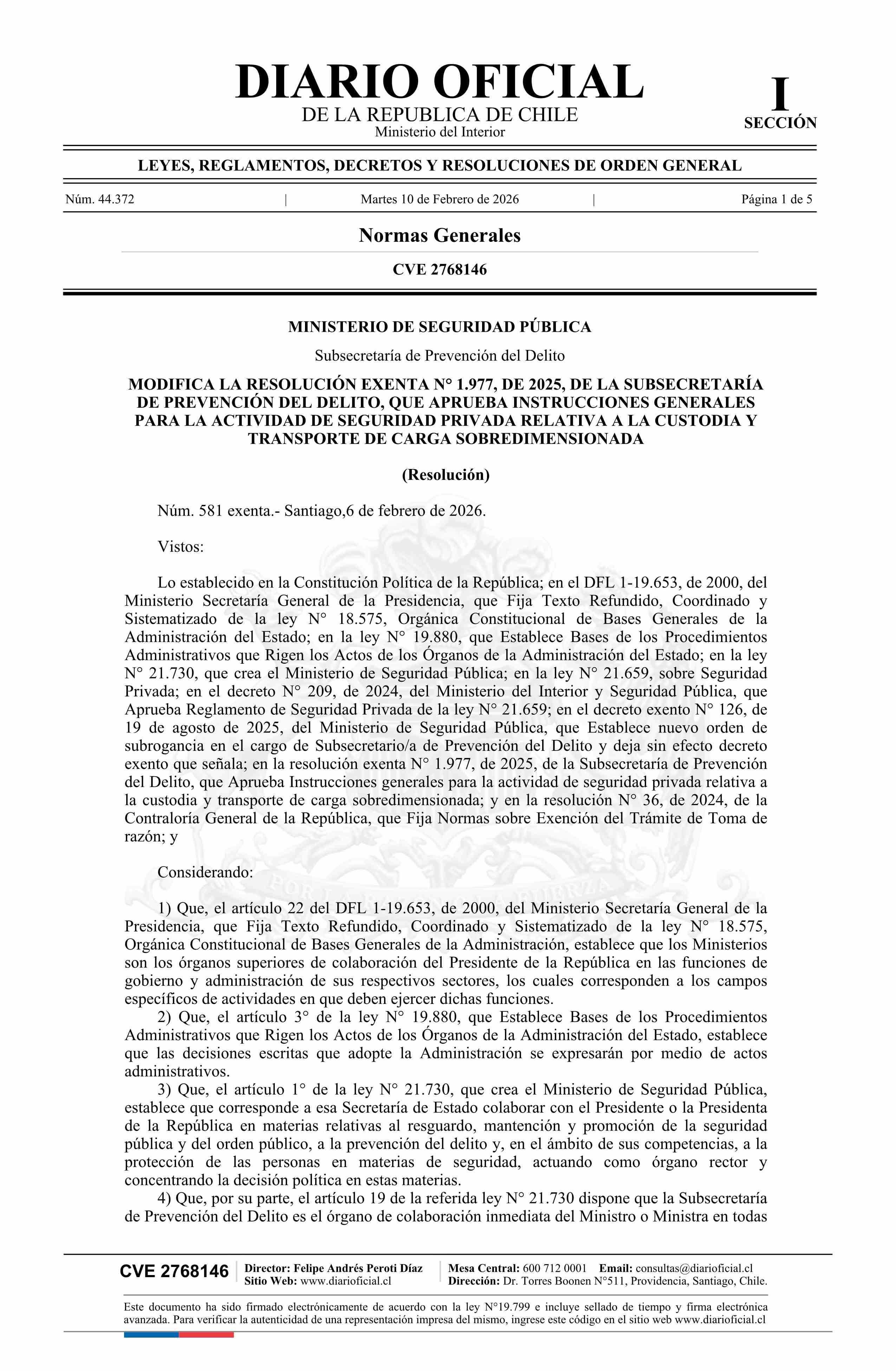 Título: Resolución exenta número 581, de 2026.- Modifica la resolución N° 1.977 exenta, de 2025, que aprueba instrucciones generales para la actividad de seguridad privada relativa a la custodia y transporte de carga sobredimensionada