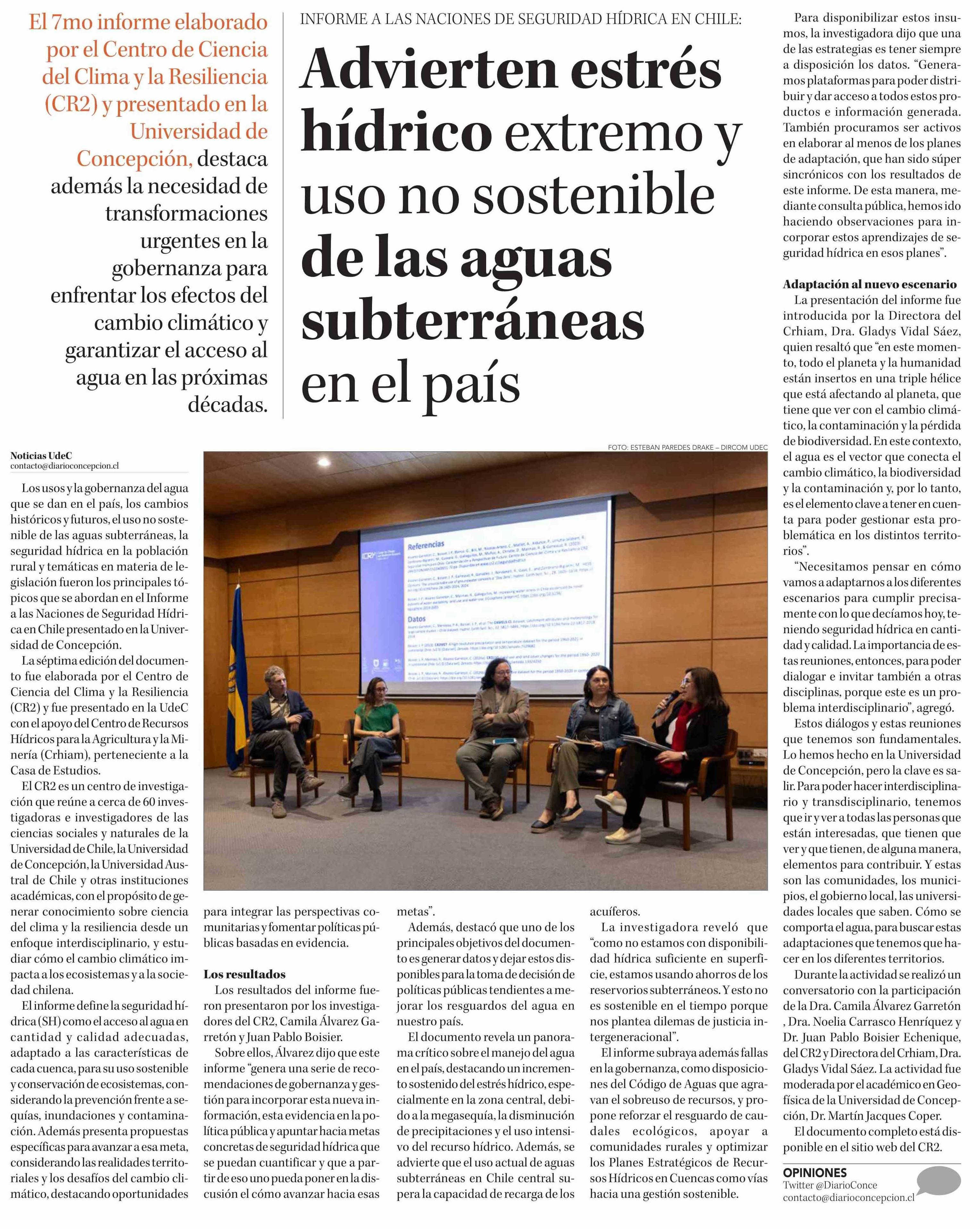 Advierten estrés hídrico extremo y uso no sostenible de las aguas subterráneas en el país 05-12-2024 Diario Concepción |