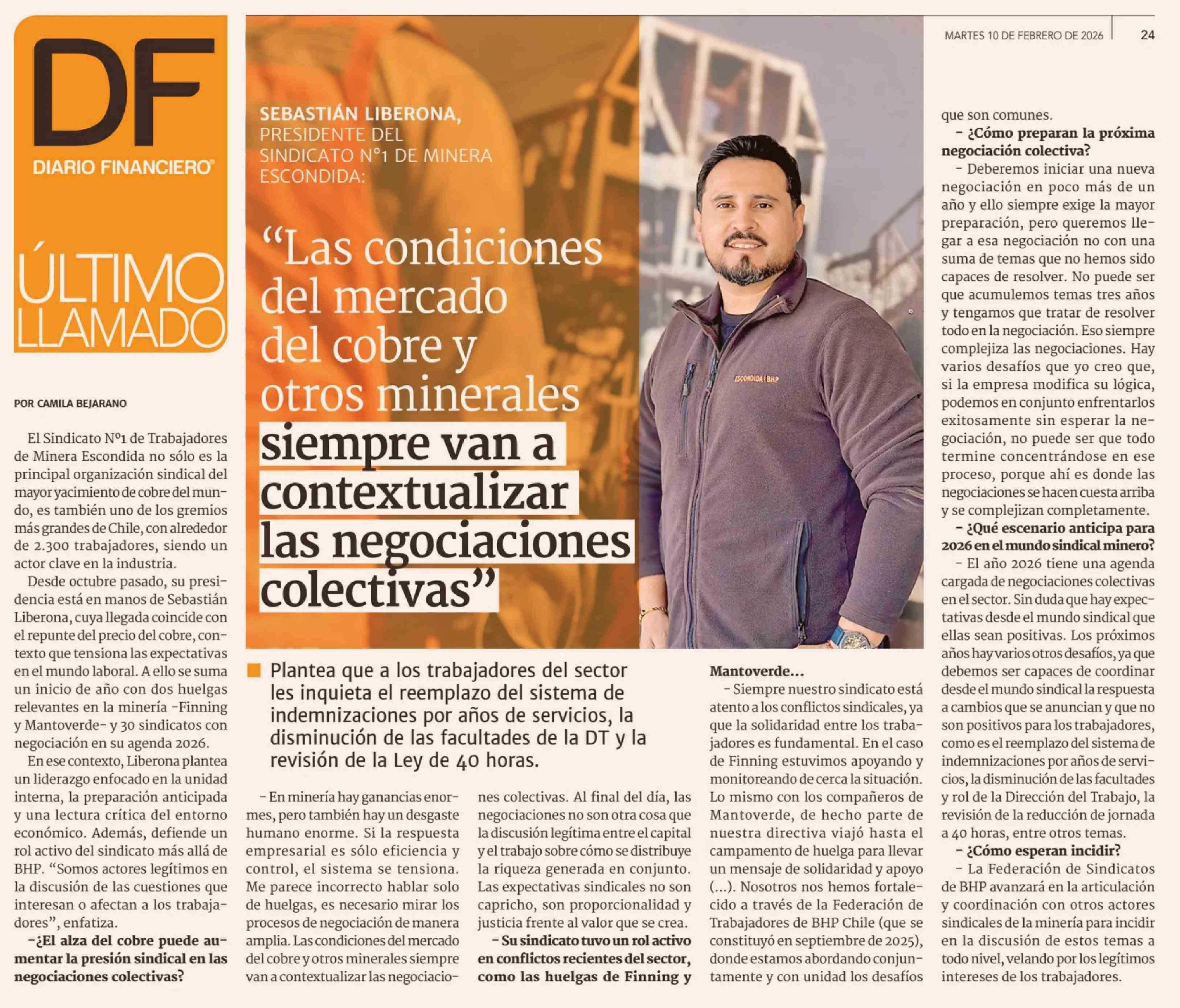 "Las condiciones del mercado del cobre y otros minerales siempre van a contextualizar las negociaciones colectivas" 10-02-2026 Diario Financiero |