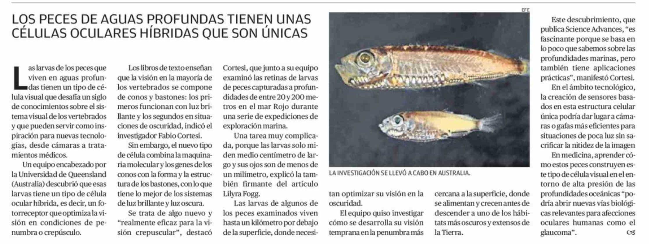 LOS PECES DE AGUAS PROFUNDAS TIENEN UNAS CÉLULAS OCULARES HÍBRIDAS QUE SON ÚNICAS 16-02-2026 El Mercurio de Calama |