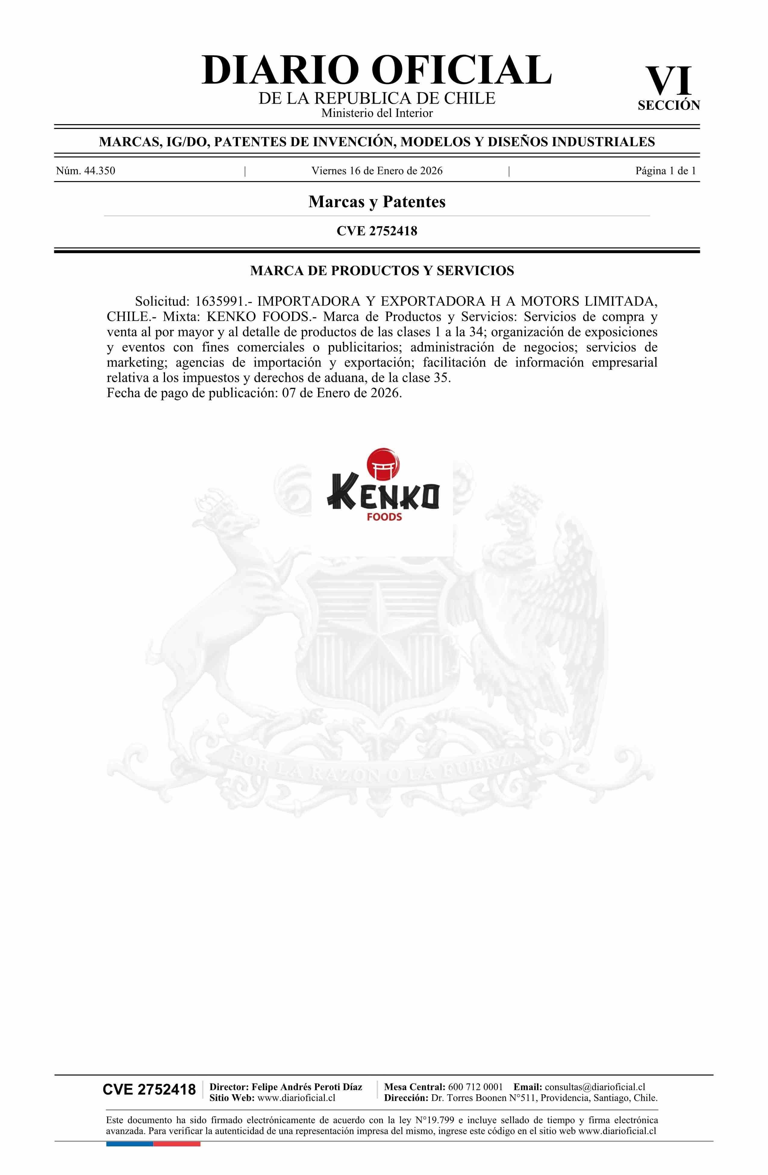 Solicitud número 1635991.- KENKO FOODS 16-01-2026 Diario Oficial Edición Electrónica |