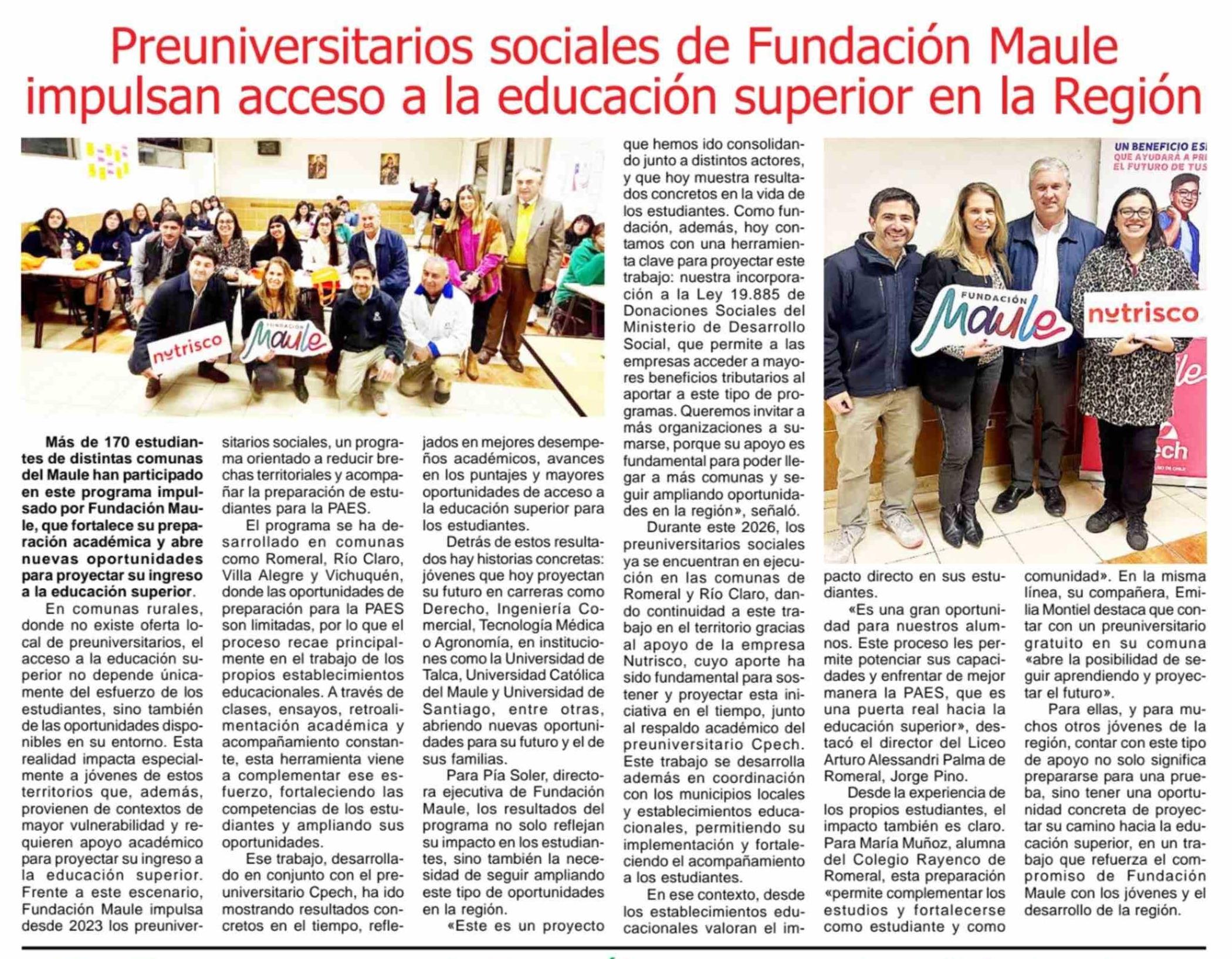 | Título: | Preuniversitarios sociales de Fundación Maule impulsan acceso a la educación superior en la Región |