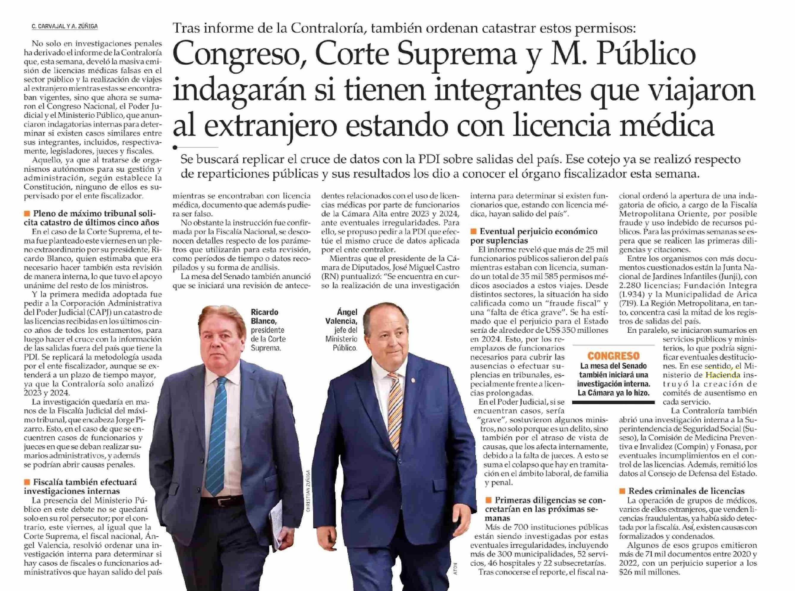 Congreso, Corte Suprema y M. Público indagarán si tienen integrantes que viajaron al extranjero estando con licencia médica 25-05-2025 El Mercurio |