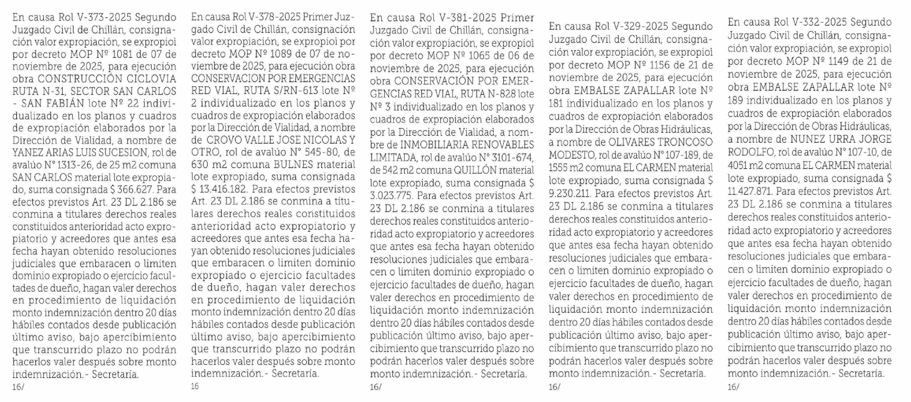 Título: En causa Rol V-343-2025 Segundo Juzgado Civil de Chillán, consignación valor expropiación, se expropioì por decreto MOP Nº 1134 de 21 de noviembre de 2025, para ejecución obra CONSTRUCCION CICLOVIA RUTA N-31, SECTOR SAN CARLOS - SAN FABIAN lote Nº 4 individualizado en los planos y cuadros de expropi
