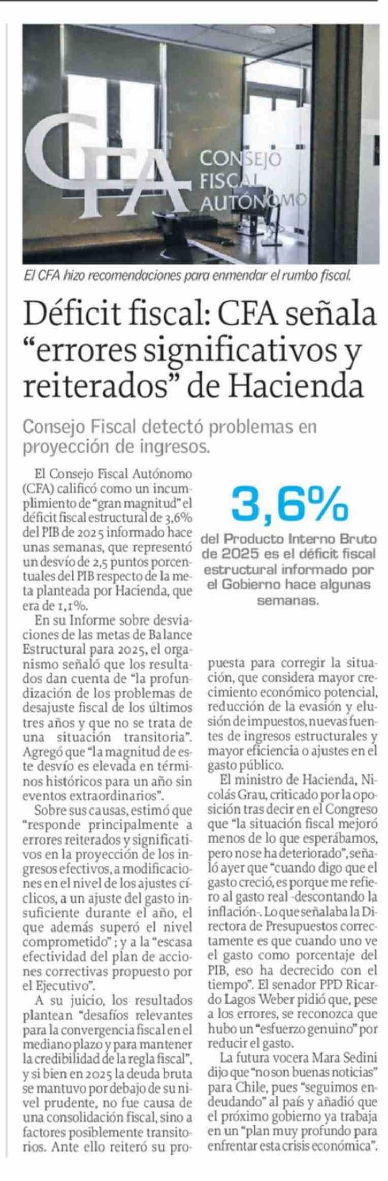 Déficit fiscal: CFA señala "errores significativos y reiterados" de Hacienda 05-03-2026 El Sur |