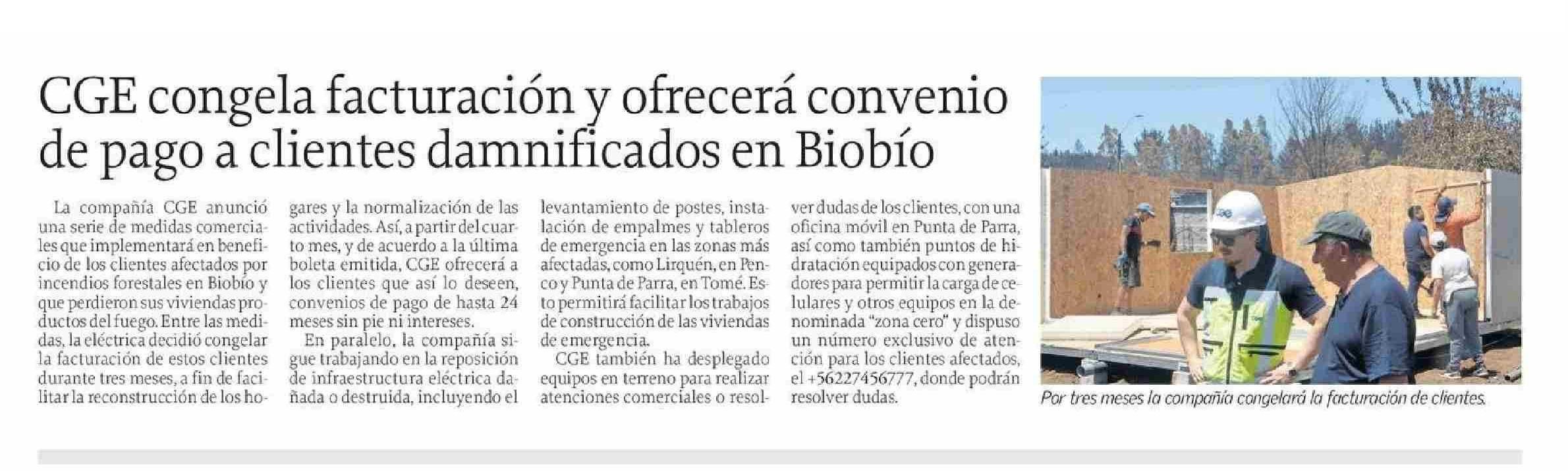 CGE congela facturación y ofrecerá convenio de pago a clientes damnificados en Biobío 31-01-2026 El Sur |