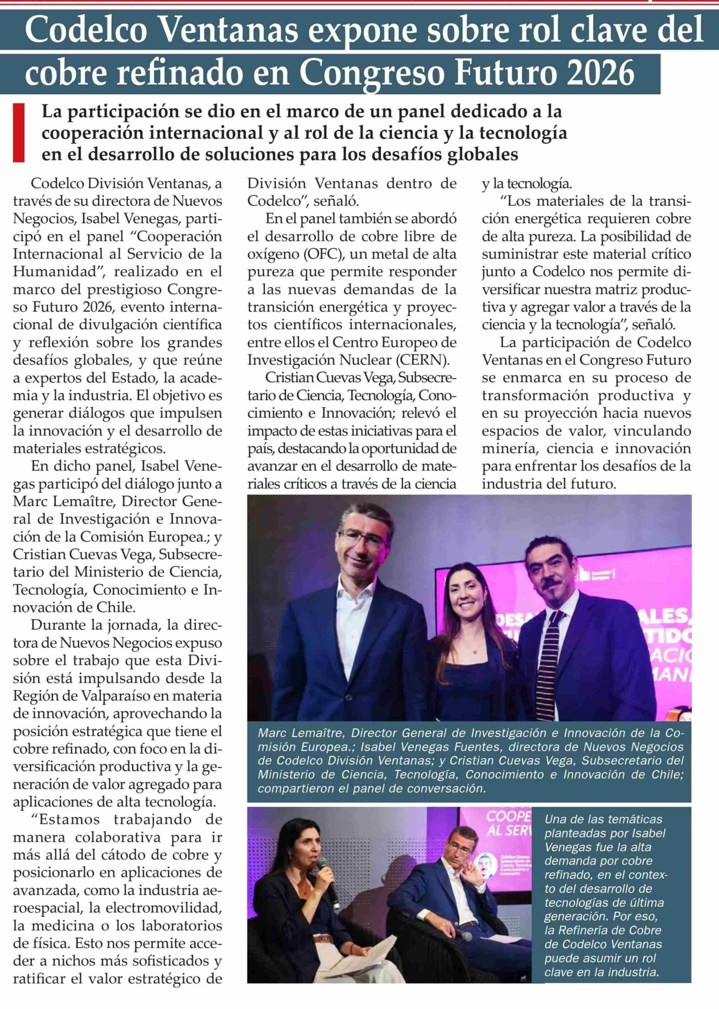 | Título: | Codelco Ventanas expone sobre rol clave del cobre refinado en Congreso Futuro 2026 |