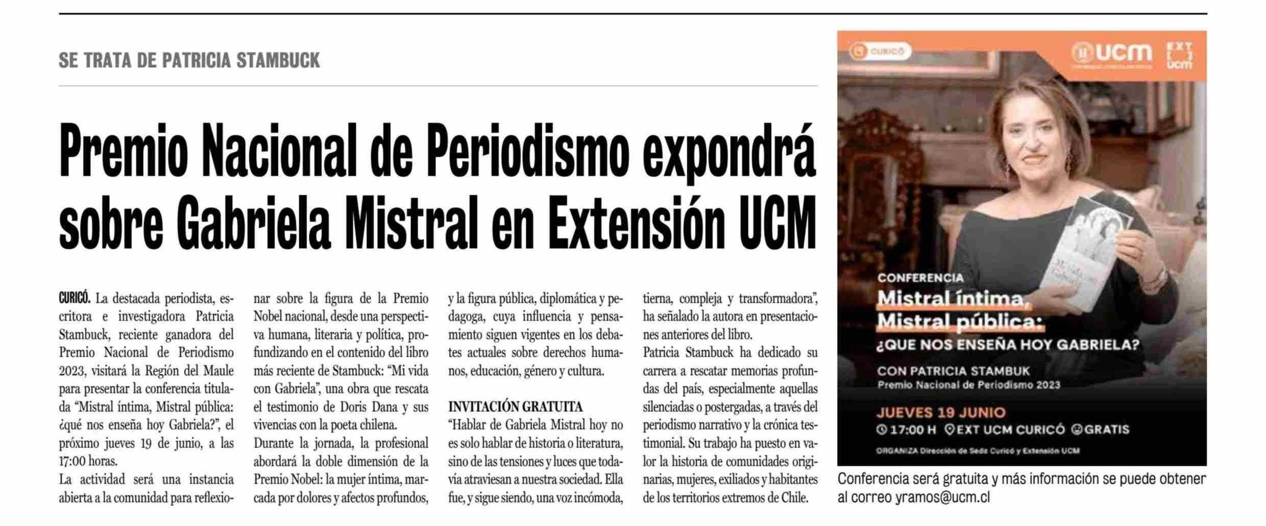 Premio Nacional de Periodismo expondrá sobre Gabriela Mistral en Extensión UCM 03-06-2025 La Prensa de Curicó |