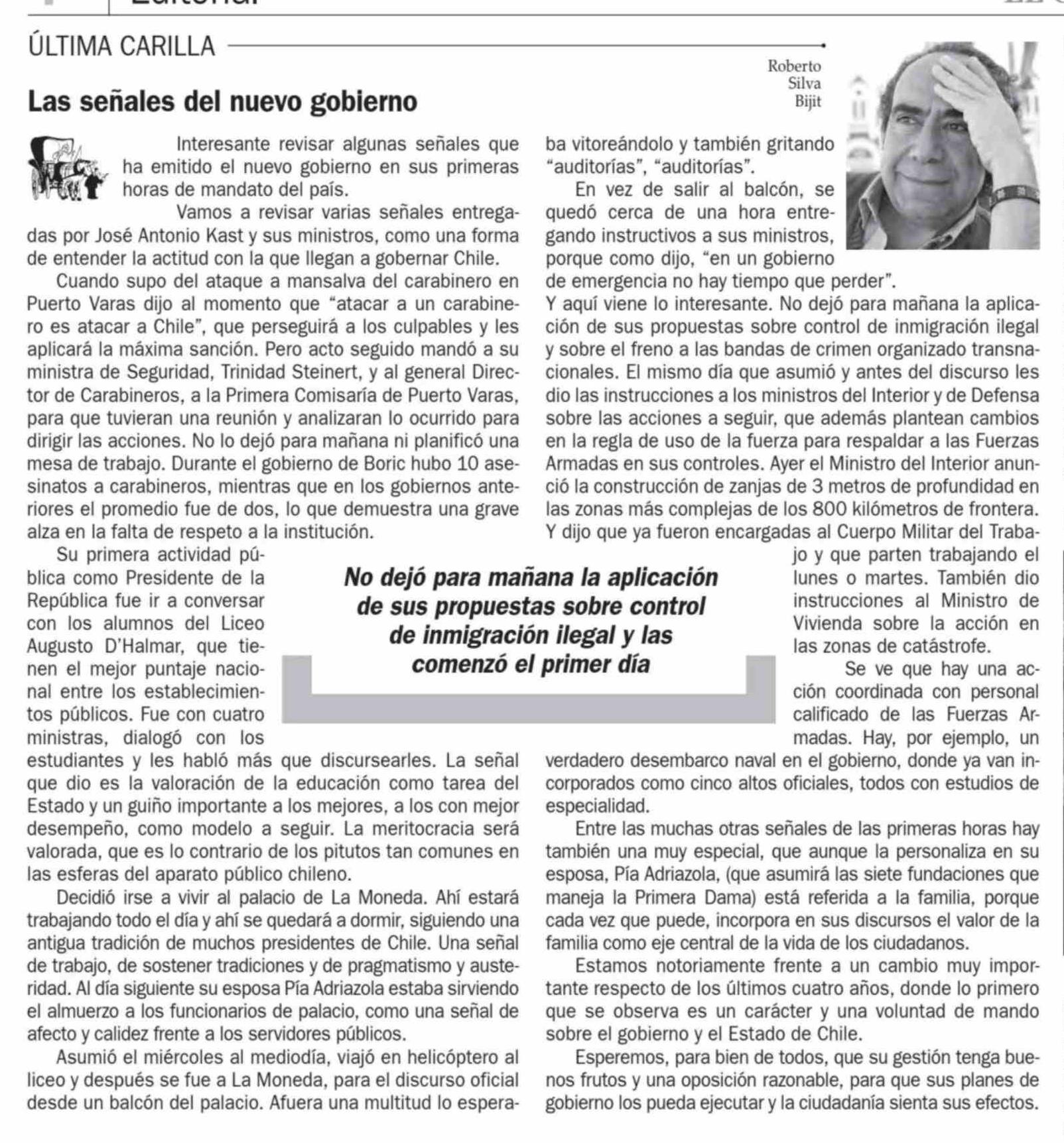 Columnas de Opinión: Las señales del nuevo gobierno 13-03-2026 El Observador |