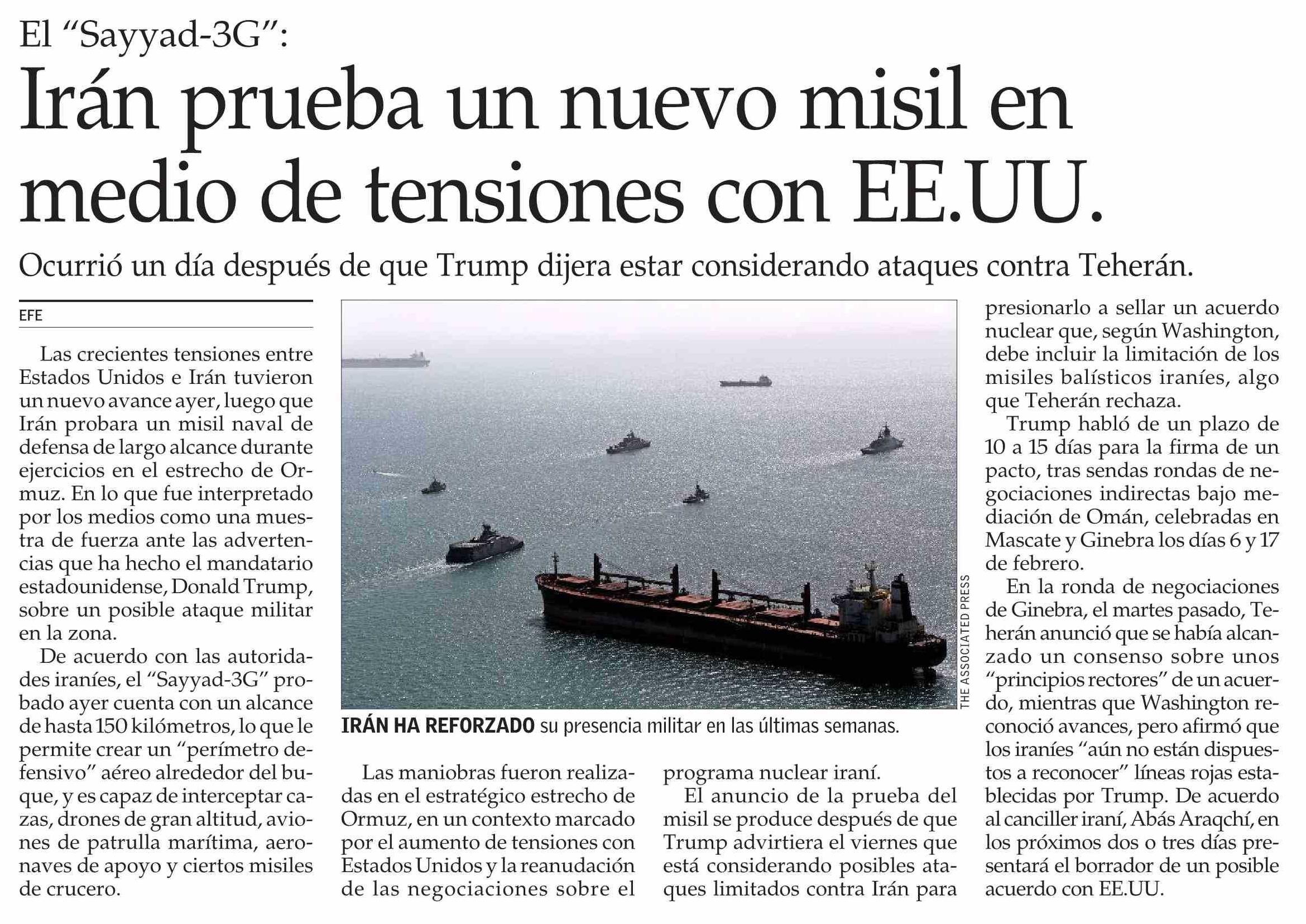 Irán prueba un nuevo misil en medio de tensiones con EE.UU. 22-02-2026 El Mercurio |