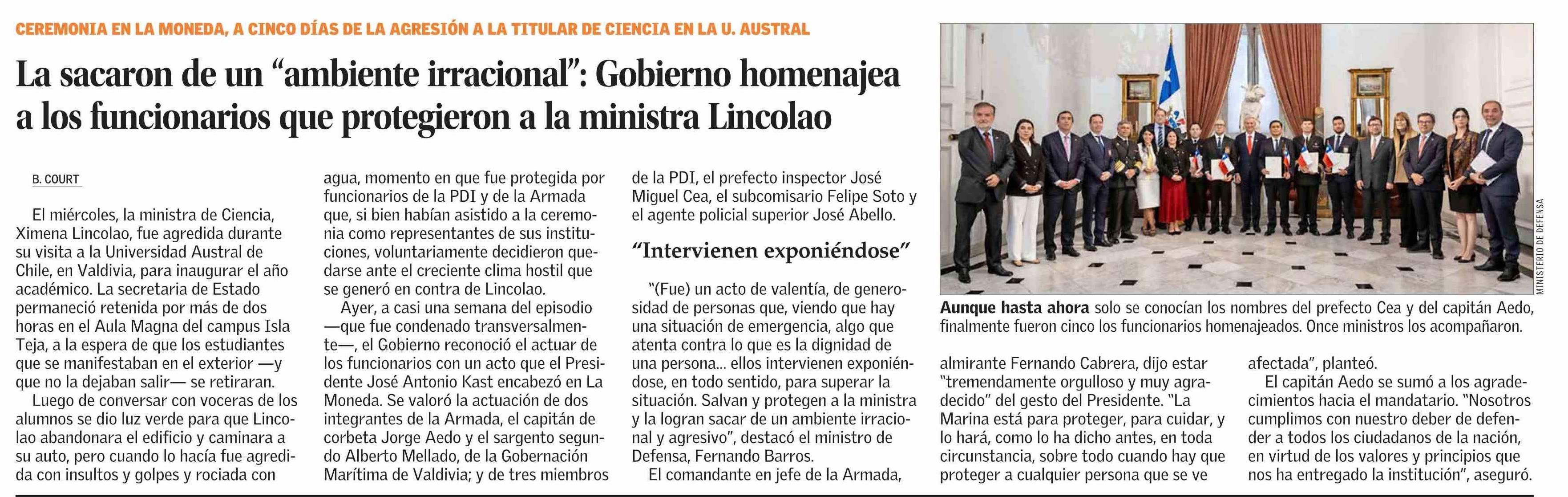Título: La sacaron de un “ambiente irracional”: Gobierno homenajea a los funcionarios que protegieron a la ministra Lincolao