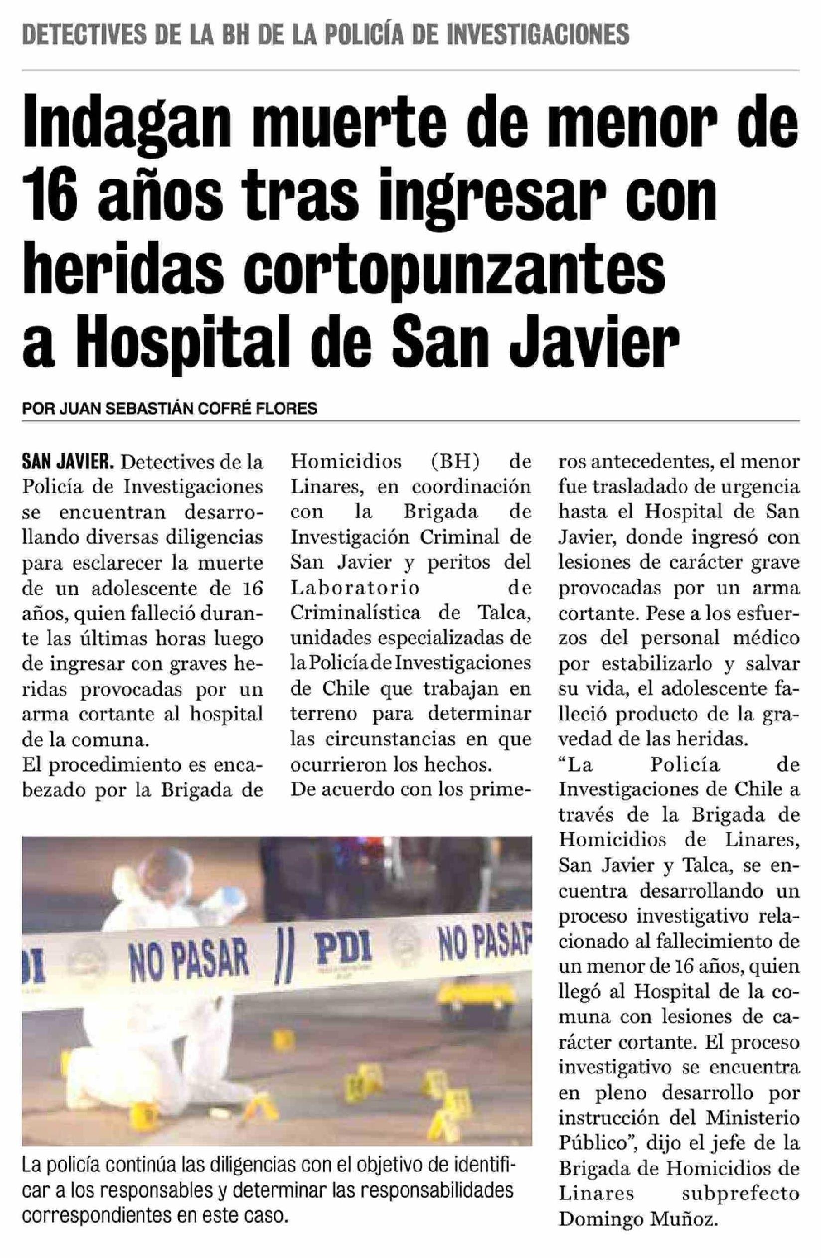 Título: Indagan muerte de menor de 16 años tras ingresar con heridas cortopunzantes a Hospital de San Javier