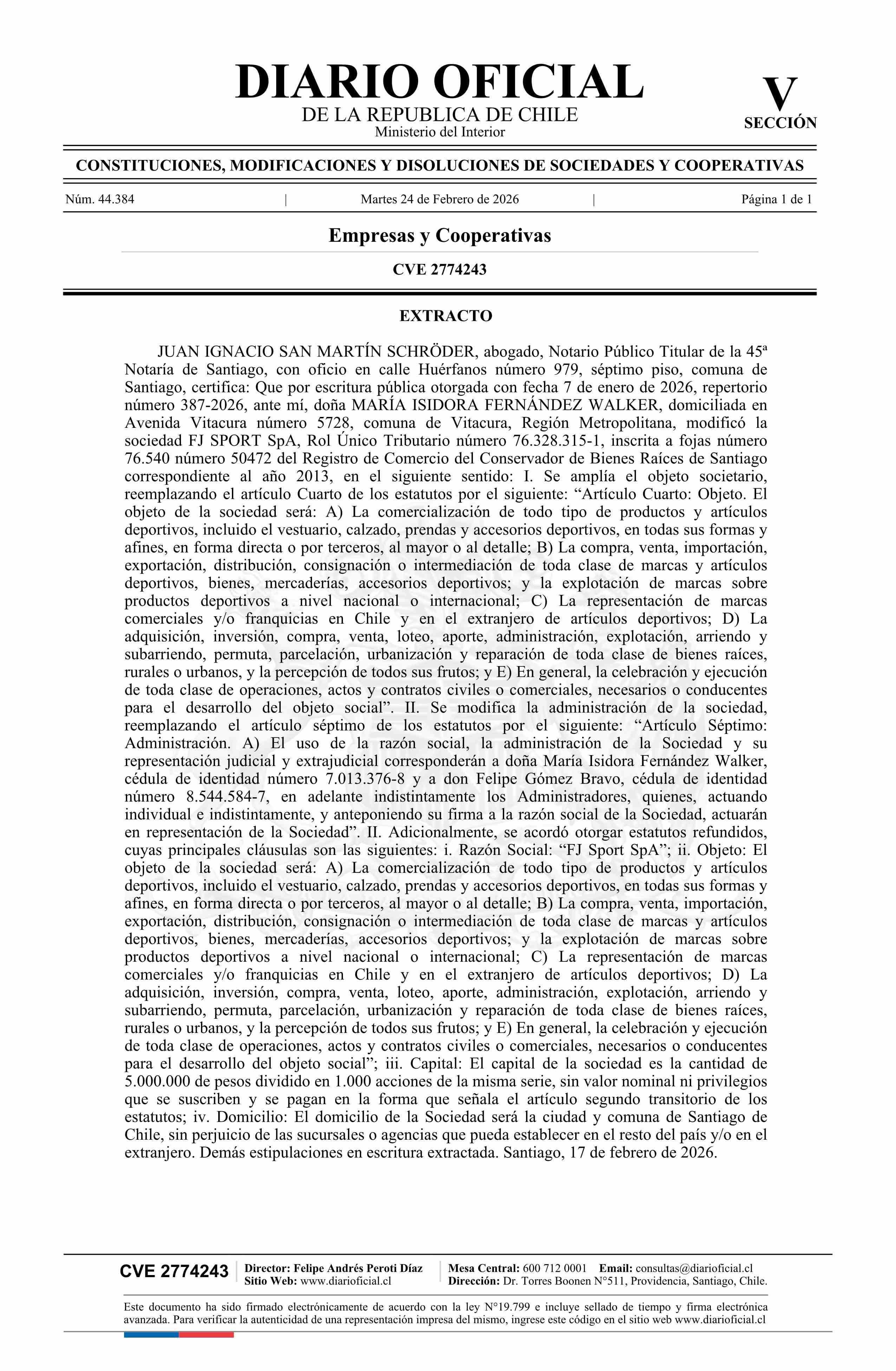 FJ SPORT SpA 76.328.315-1* 24-02-2026 Diario Oficial Edición Electrónica |