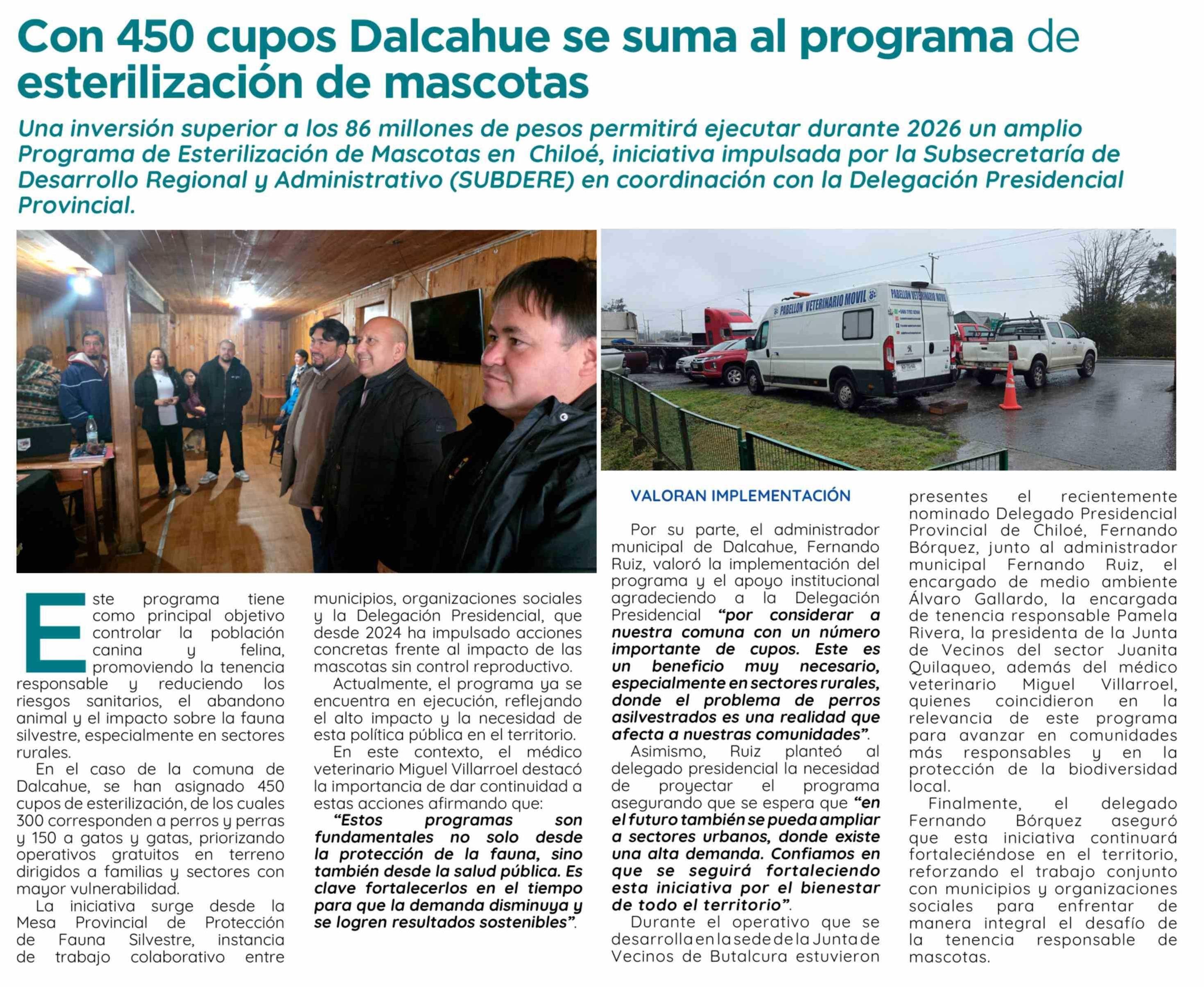 | Título: | Con 450 cupos Dalcahue se suma al programa de esterilización de mascotas |