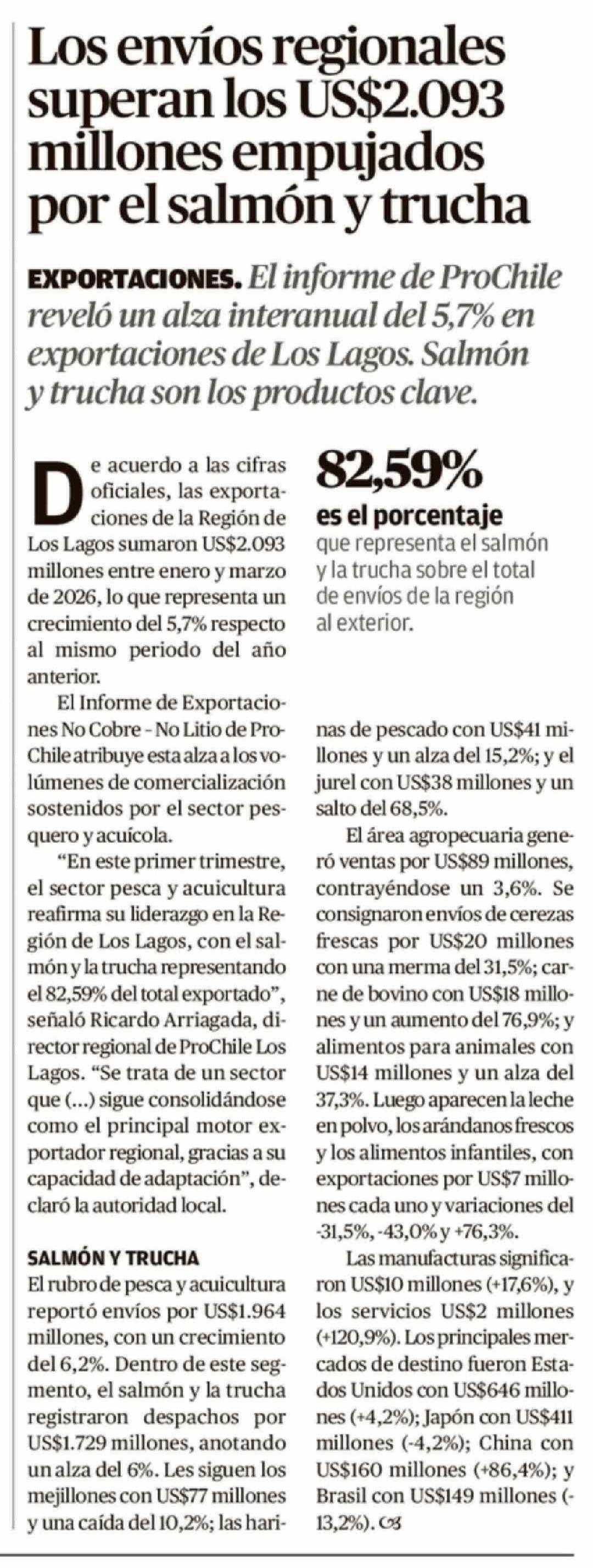 Los envíos regionales superan los US$2.093 millones empujados por el salmón y trucha 17-04-2026 El Llanquihue |