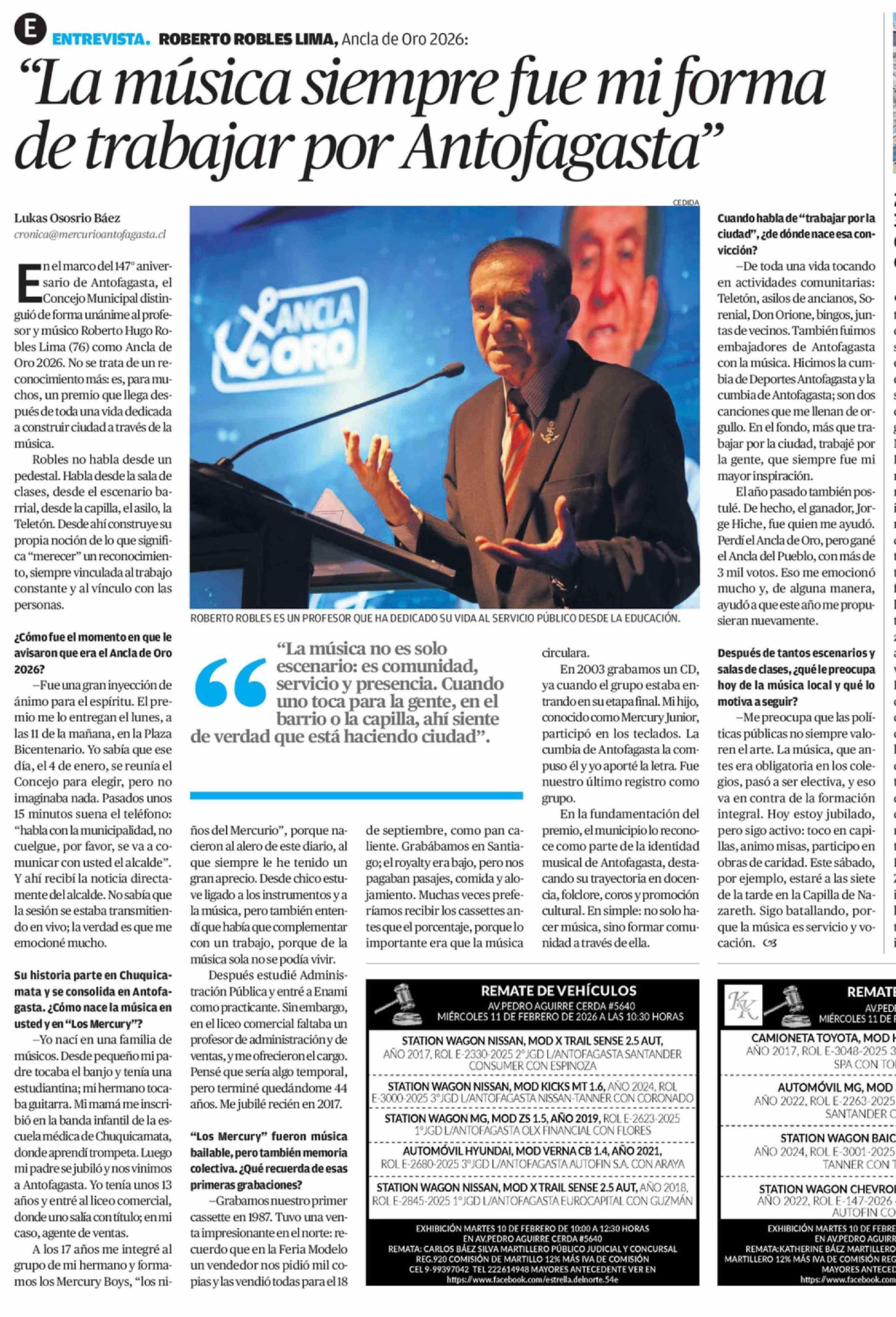 "La música siempre fue mi forma de trabajar por Antofagasta" 10-02-2026 El Mercurio de Antofagasta |