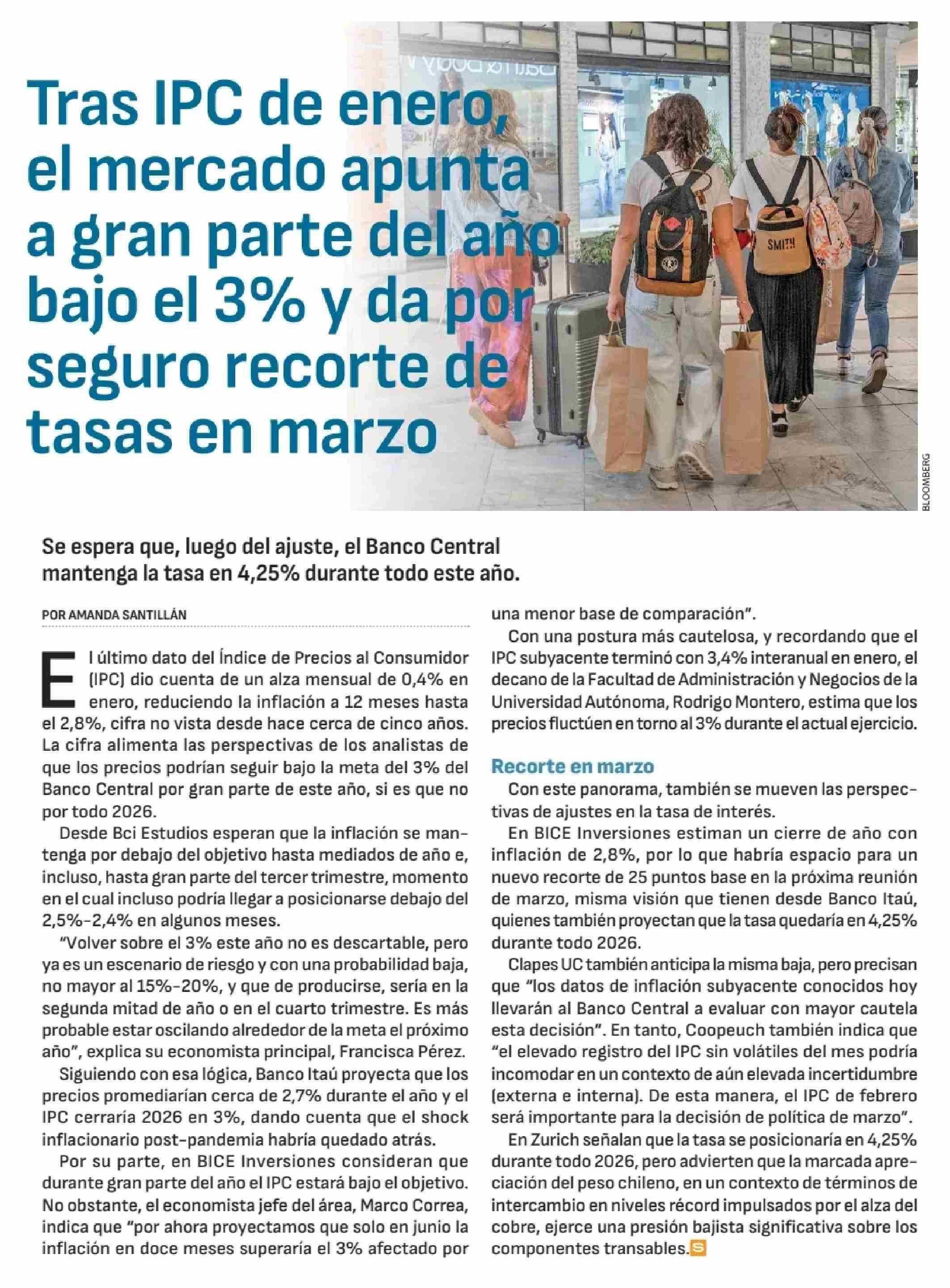 Tras IPC de enero el mercado apunta a gran parte del año bajo el 3% y da por seguro recorte de tasas en marzo 07-02-2026 Diario Financiero |