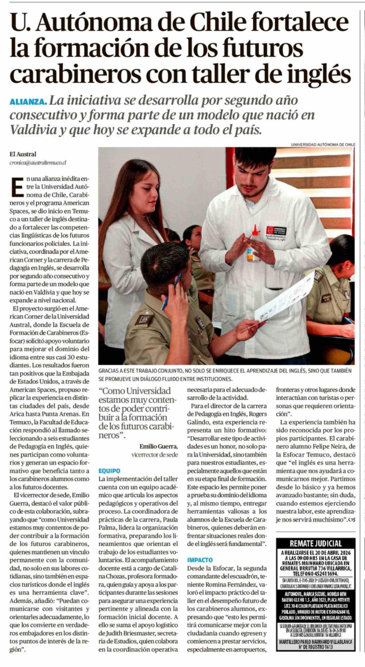 U. Autónoma de Chile fortalece la formación de los futuros carabineros con taller de inglés 14-04-2026 El Austral de la Araucanía |