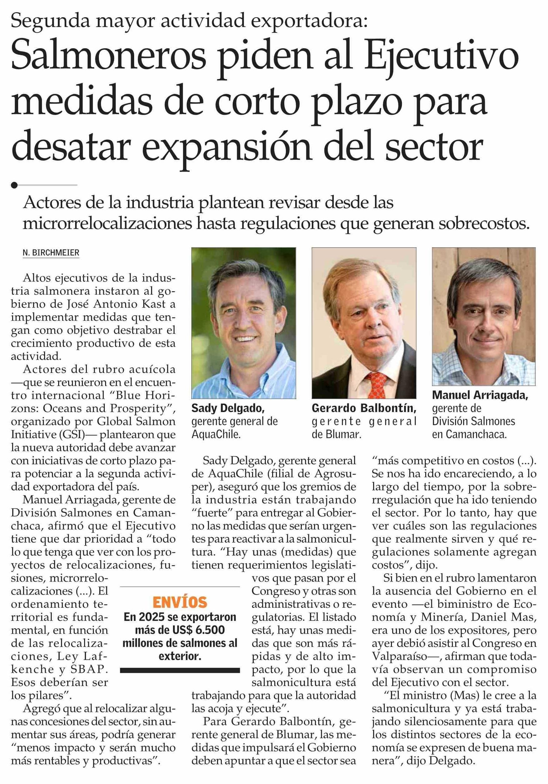 Salmoneros piden al Ejecutivo medidas de corto plazo para desatar expansión del sector 16-04-2026 El Mercurio |