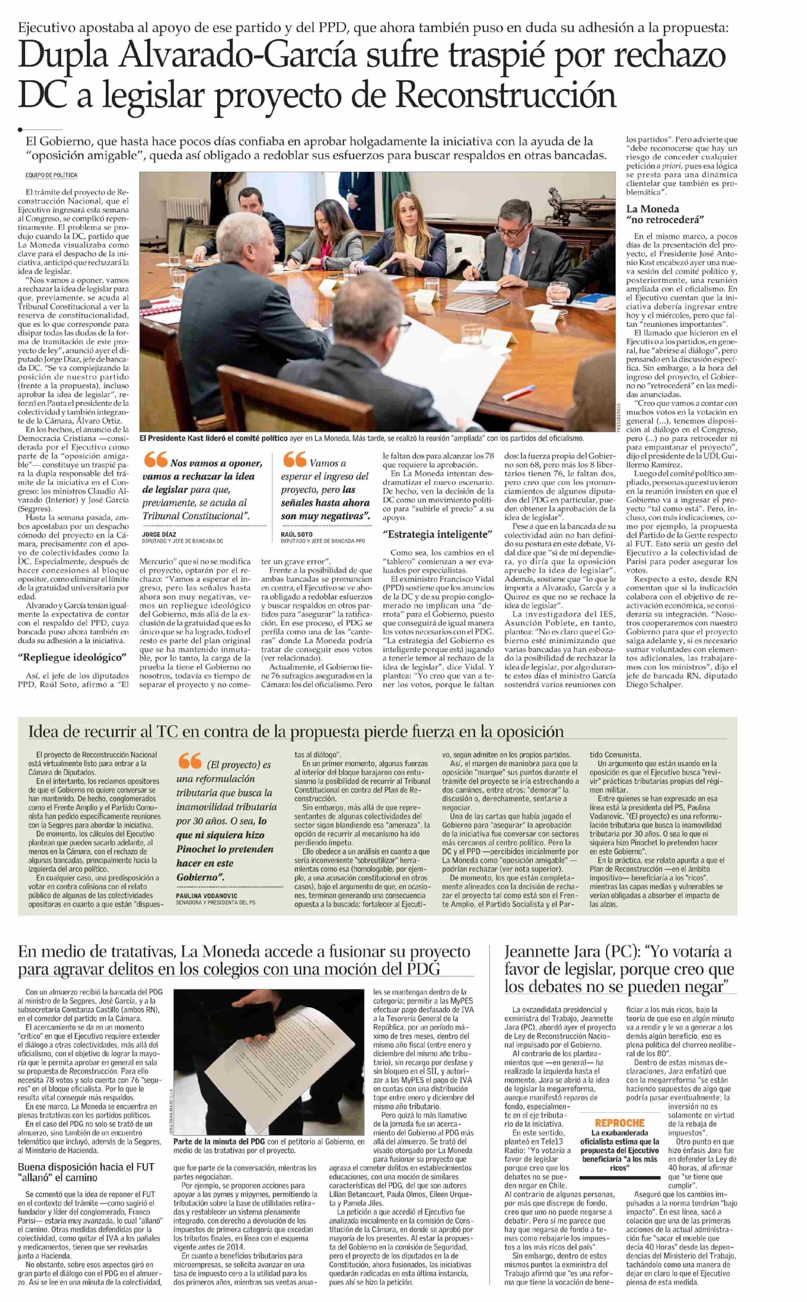 Dupla Alvarado-García sufre traspié por rechazo DC a legislar proyecto de Reconstrucción 21-04-2026 El Mercurio |