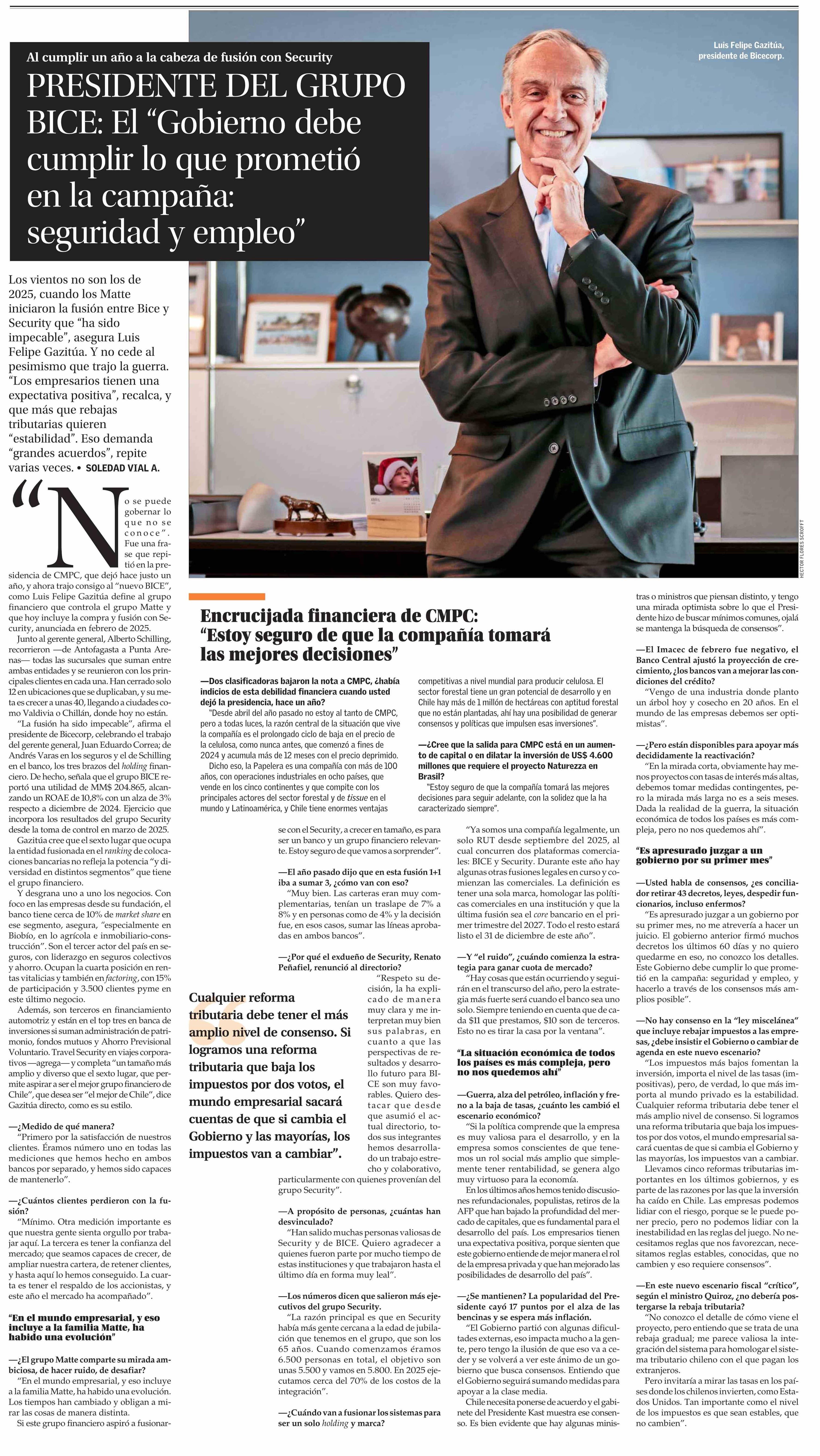 Título: PRESIDENTE DEL GRUPO BICE: El “Gobierno debe cumplir lo que prometió en la campaña: seguridad y empleo”