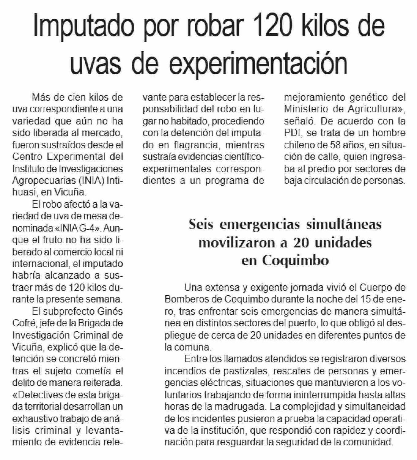 Imputado por robar 120 kilos de uvas de experimentación 17-01-2026 Diario la Región |