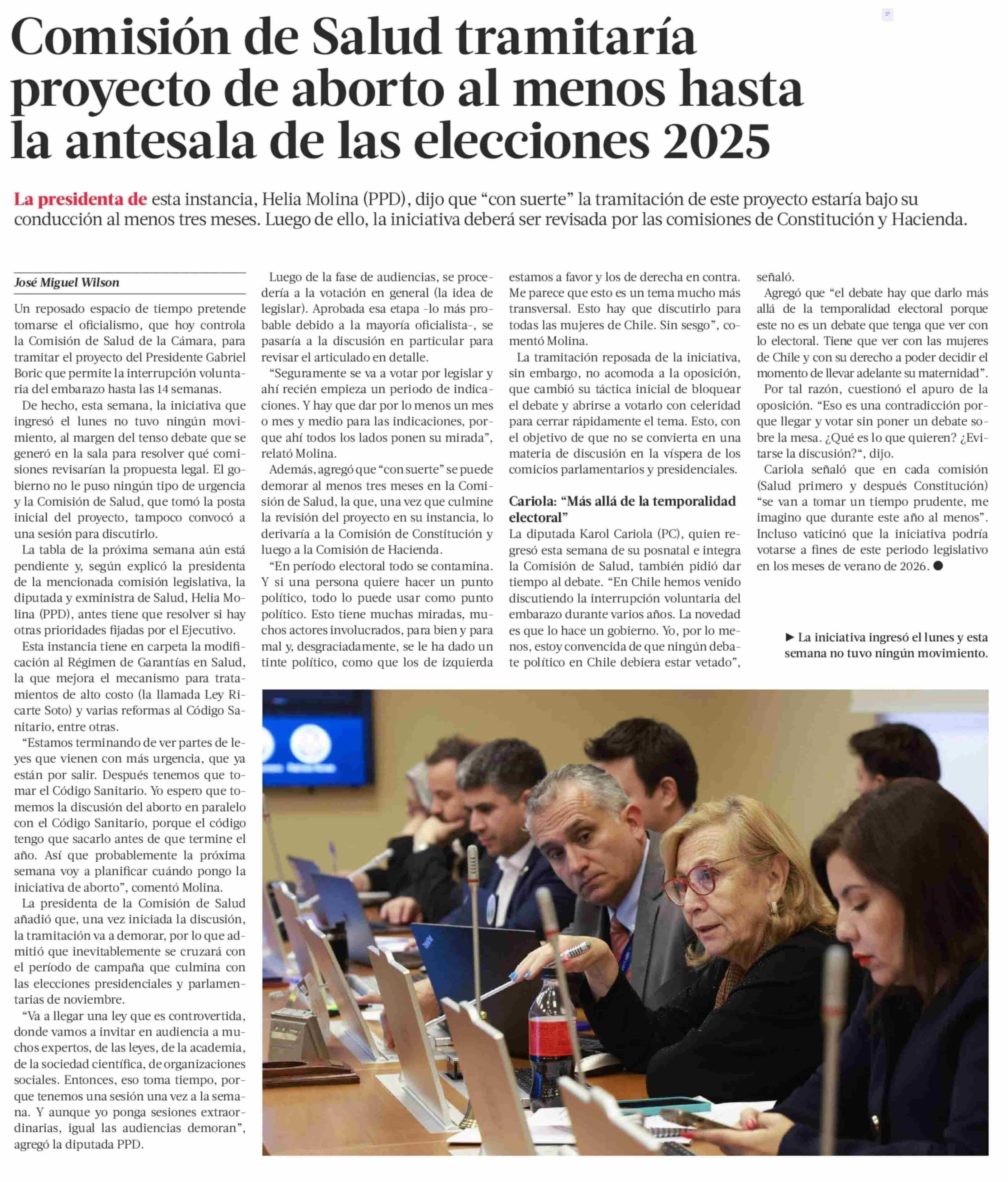 Comisión de Salud tramitaría proyecto de aborto al menos hasta la antesala de las elecciones 2025 05-06-2025 La Tercera |