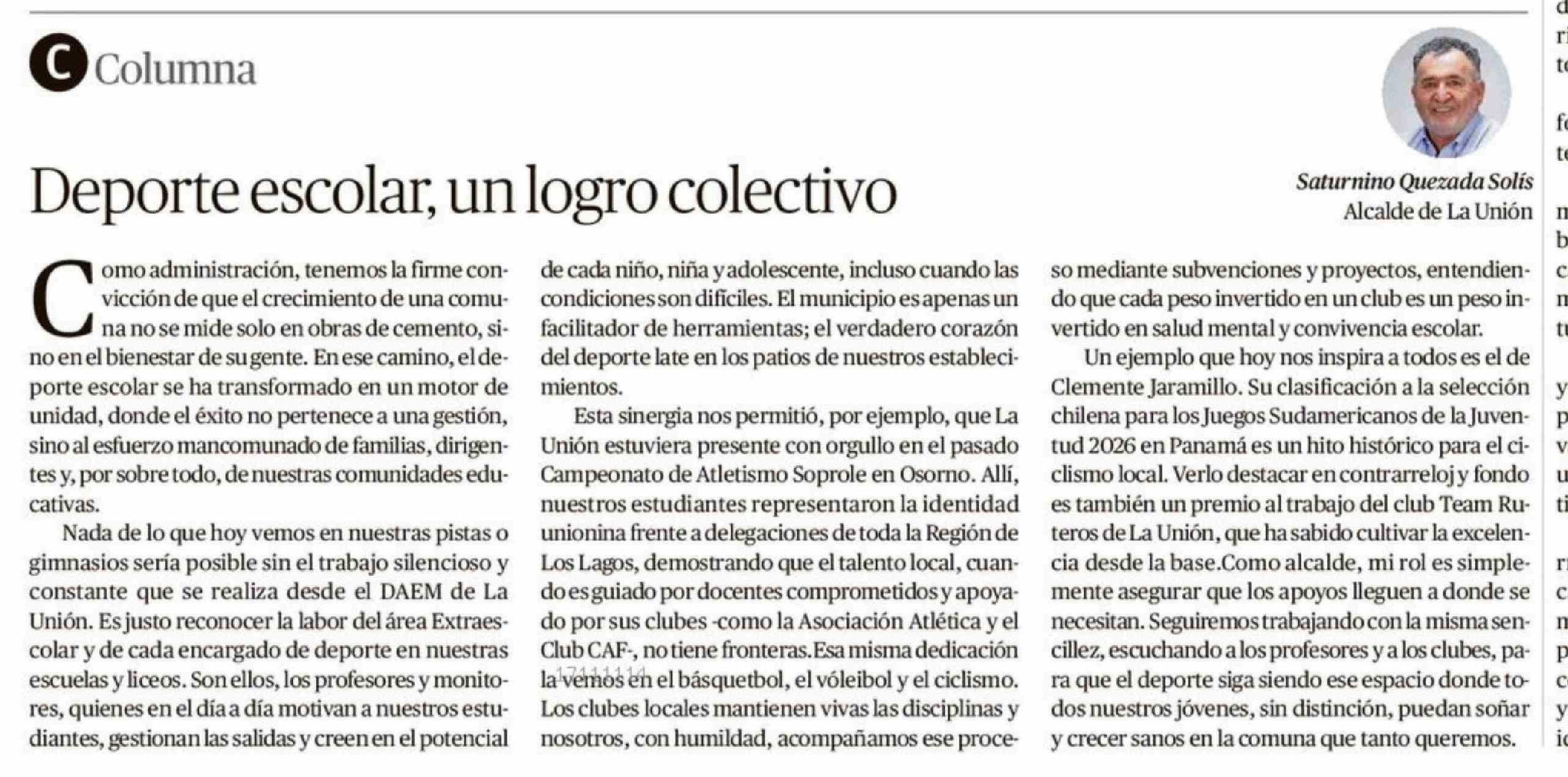 Columnas de Opinión: Deporte escolar, un logro colectivo 16-04-2026 Diario Austral Región de Los Ríos |