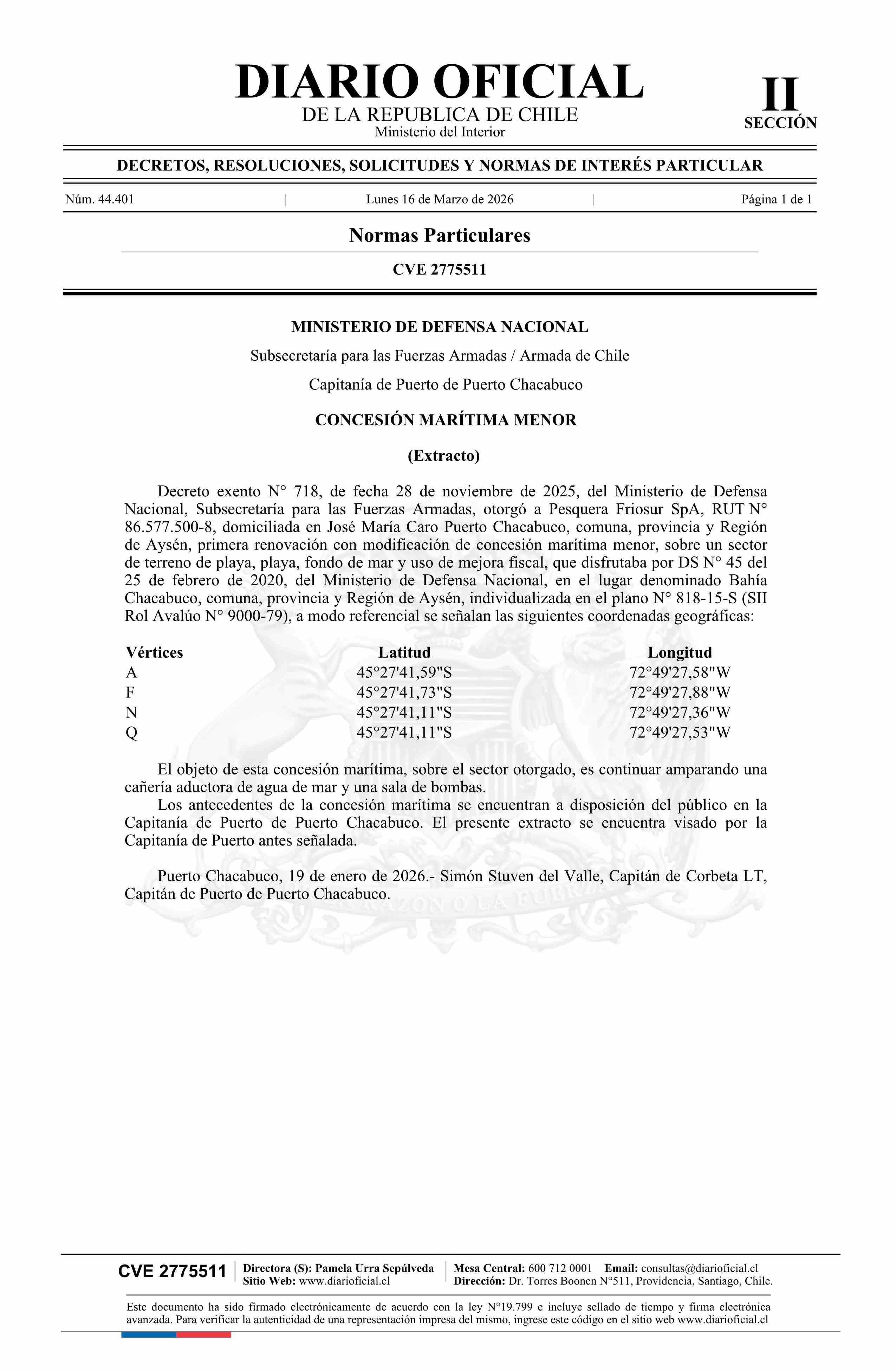 Extracto de decreto exento número 718, de 2025.- Concesión marítima menor