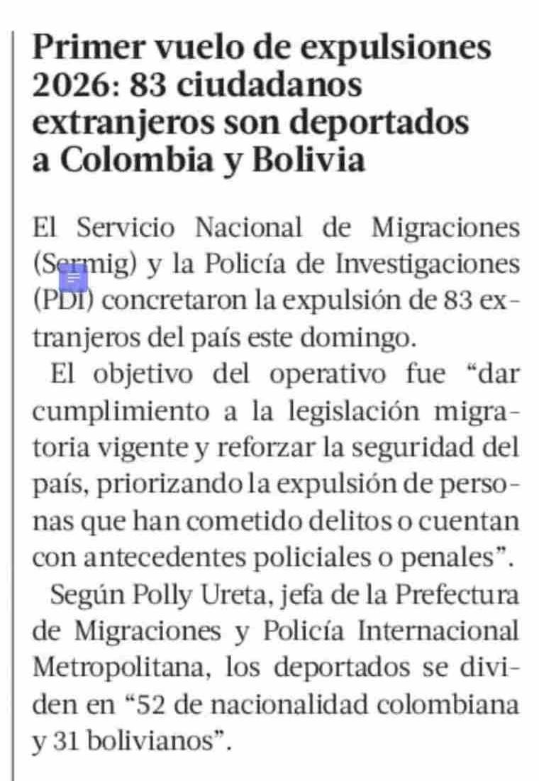 Primer vuelo de expulsiones 2026: 83 ciudadanos extranjeros son deportados a Colombia y Bolivia 26-01-2026 La Tercera |